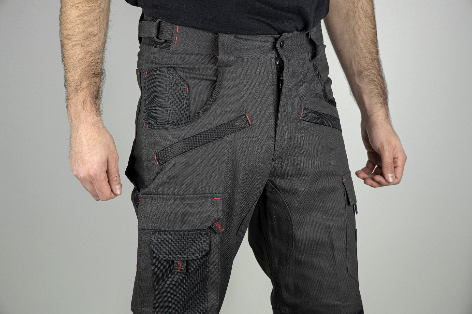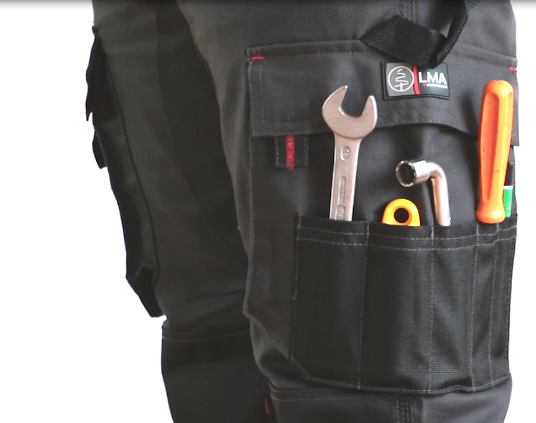 Tightenable belt with elastic tapes on sides - Zipper fly - 2 western pockets with 1 pocket - 2 zipped pockets - Two-position kneepad pockets in strong 900D Oxford fabric - Left side: gusseted leg pocket + tool pocket - Right side: 1 gusseted leg pocket + phone pocket - Back side: 2 semi-floating pockets with velcro, 1 with flap - Ruler pocket + pen pocket - Raised back with 1 large belt loop - Reinforced back leg end + various yokes and parts in string waterproof 900D Oxford fabric - Front and back reinforced crotches - Triple stitches