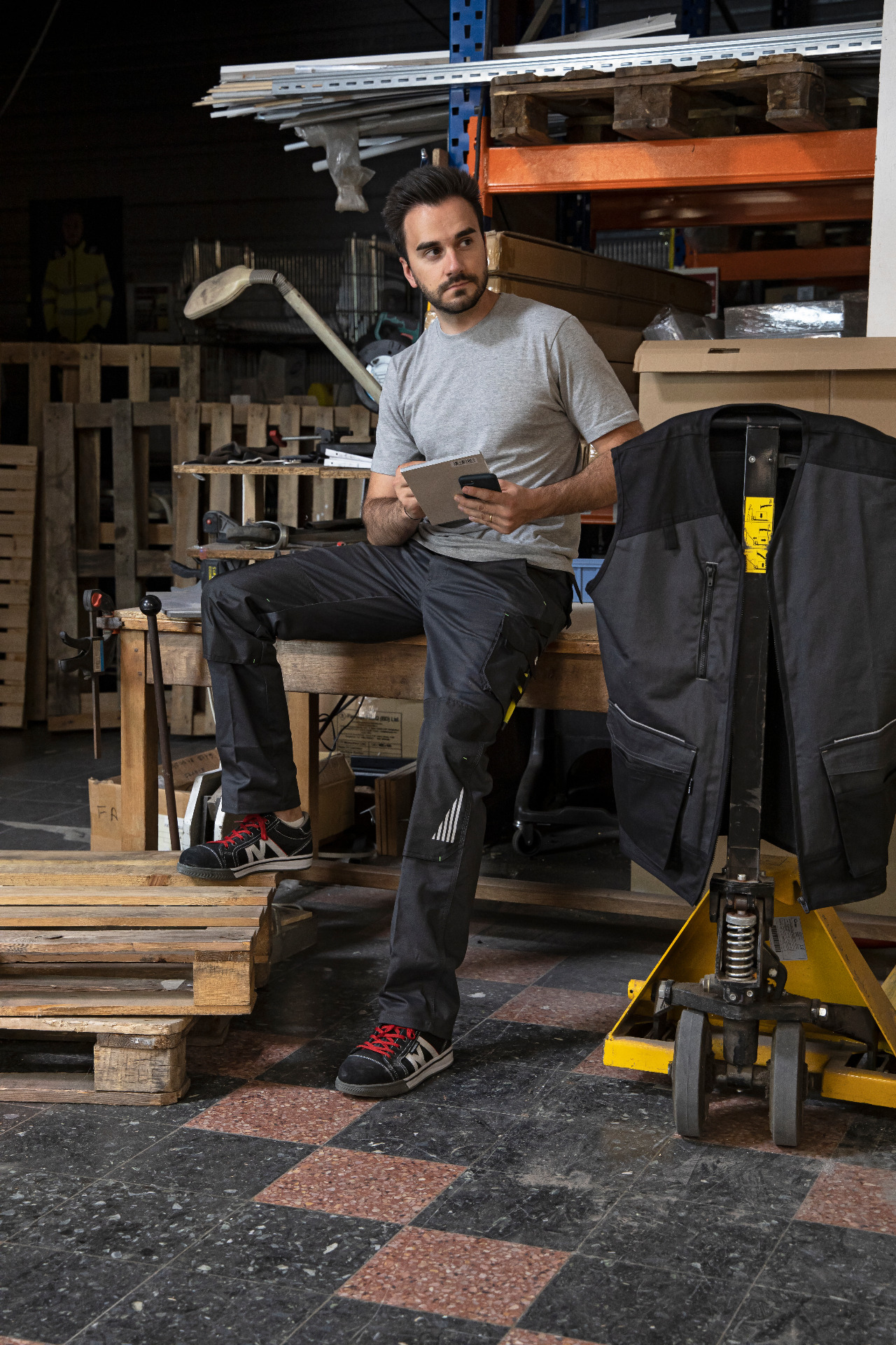 Half hidden button - Waistband elasticated on sides with 5 loops - Vision zipped fly - Wide loop on back middle - Italian handpockets with Oxford reinforcement yoke - Left thigh patched pocket + gusset, and flap closed with magic tape - Toolholder system - 1 position Oxford knee pockets - 2 back pockets with gusset, (one with flap) closed with magic tape - Hammer loop - Ruler pocket + extra pocket - Triple overstitches on crotch and leg sides - Reflective transfer on left knee pocket