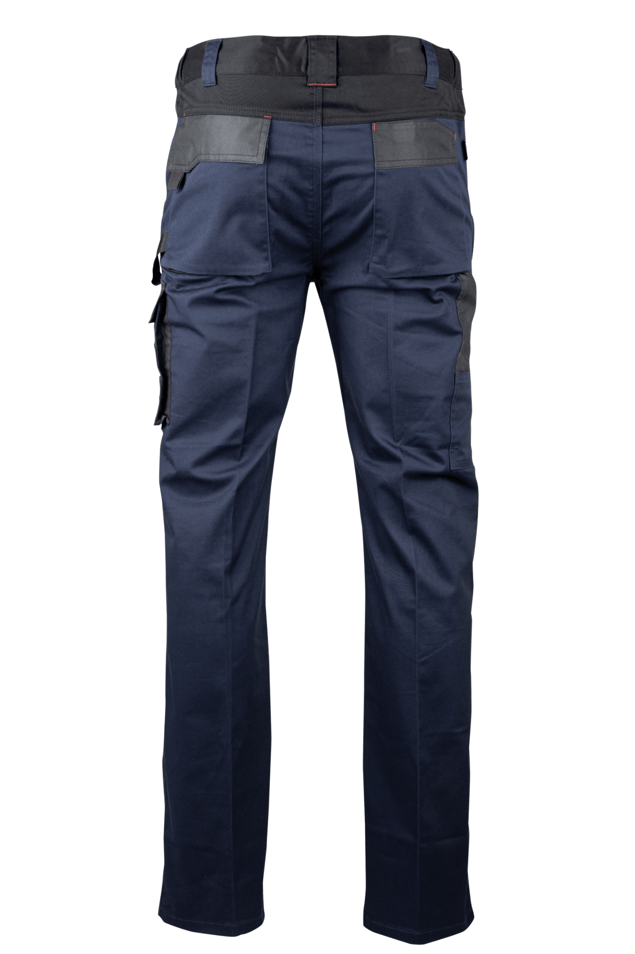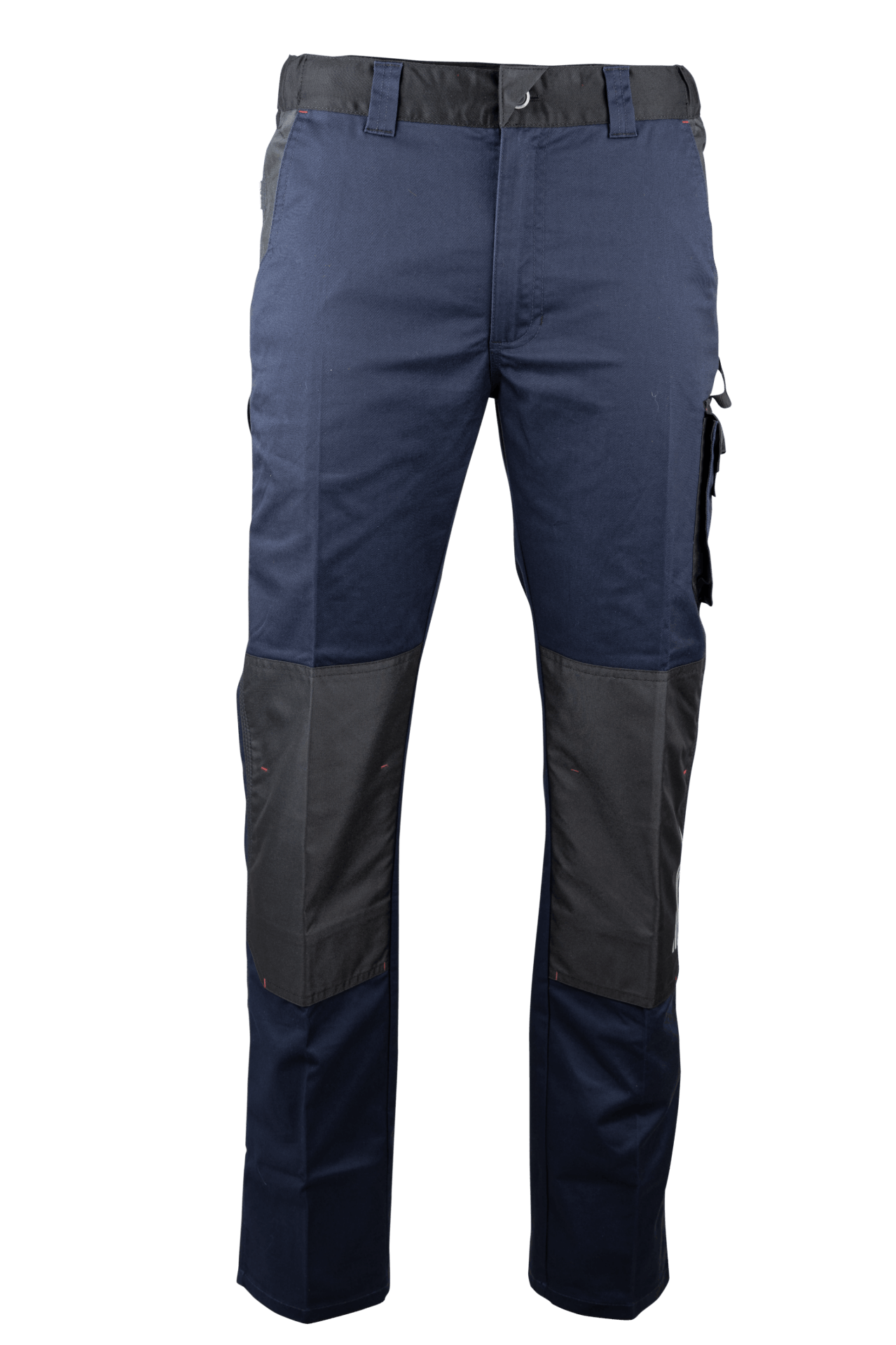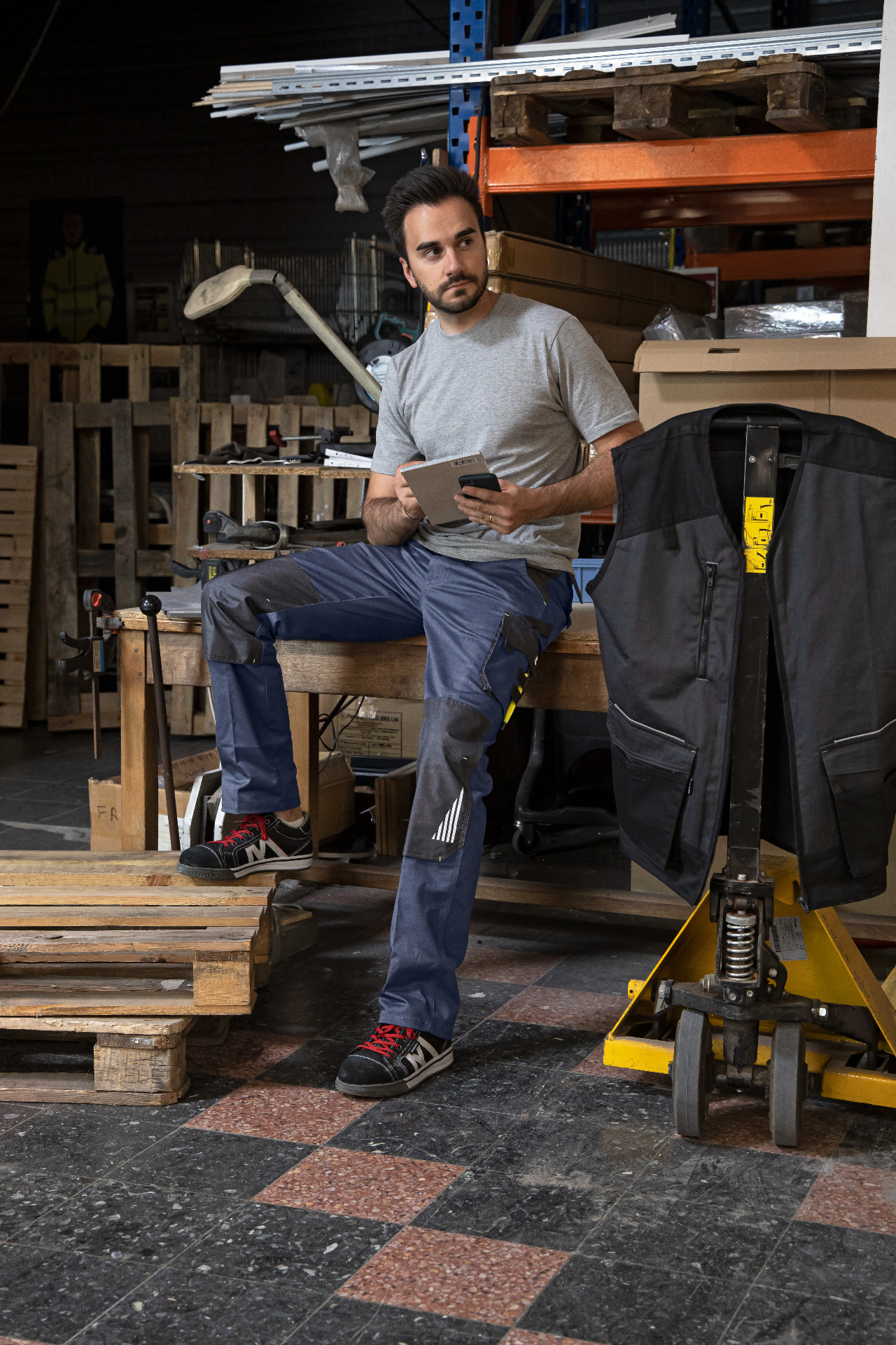 Half hidden button - Waistband elasticated on sides with 5 loops - Vision zipped fly - Wide loop on back middle - Italian handpockets with Oxford reinforcement yoke - Left thigh patched pocket + gusset, and flap closed with magic tape - Toolholder system - 1 position Oxford knee pockets - 2 back pockets with gusset, (one with flap) closed with magic tape - Hammer loop - Ruler pocket + extra pocket - Triple overstitches on crotch and leg sides - Reflective transfer on left knee pocket