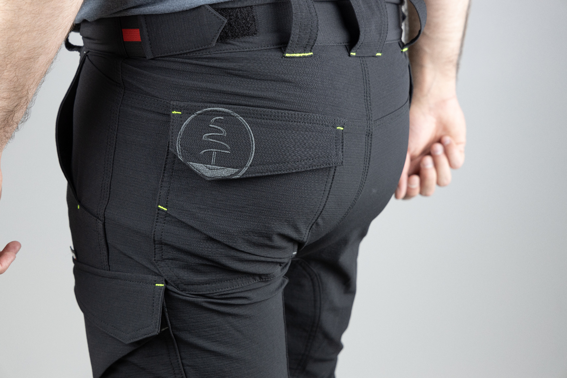 Flexible plastic 4 holes button ⌀ 20mm - Vision zipped fly - Belt with 5 loops + 1 wide loop on back middle with raised back - Non-slip waistline and adjustable with back elastic tape - Italian hand pockets - Left thigh pocket closed with flap + magic tape, extra pocket closed with zipper - Right thigh pocket with gusset closed with zipper with ruler pocket opening on top - Left back pocket with gusset, closed with flap + magic tape - 300D Oxford hammer holder - crotch reinforcement yoke in main fabric - 300D Oxford leg bottom reinforcement yoke - Knee reinforcement yoke in main fabric - Magic hem + 2 inches - Pre-bent knee yokes - Embroidery on front and back