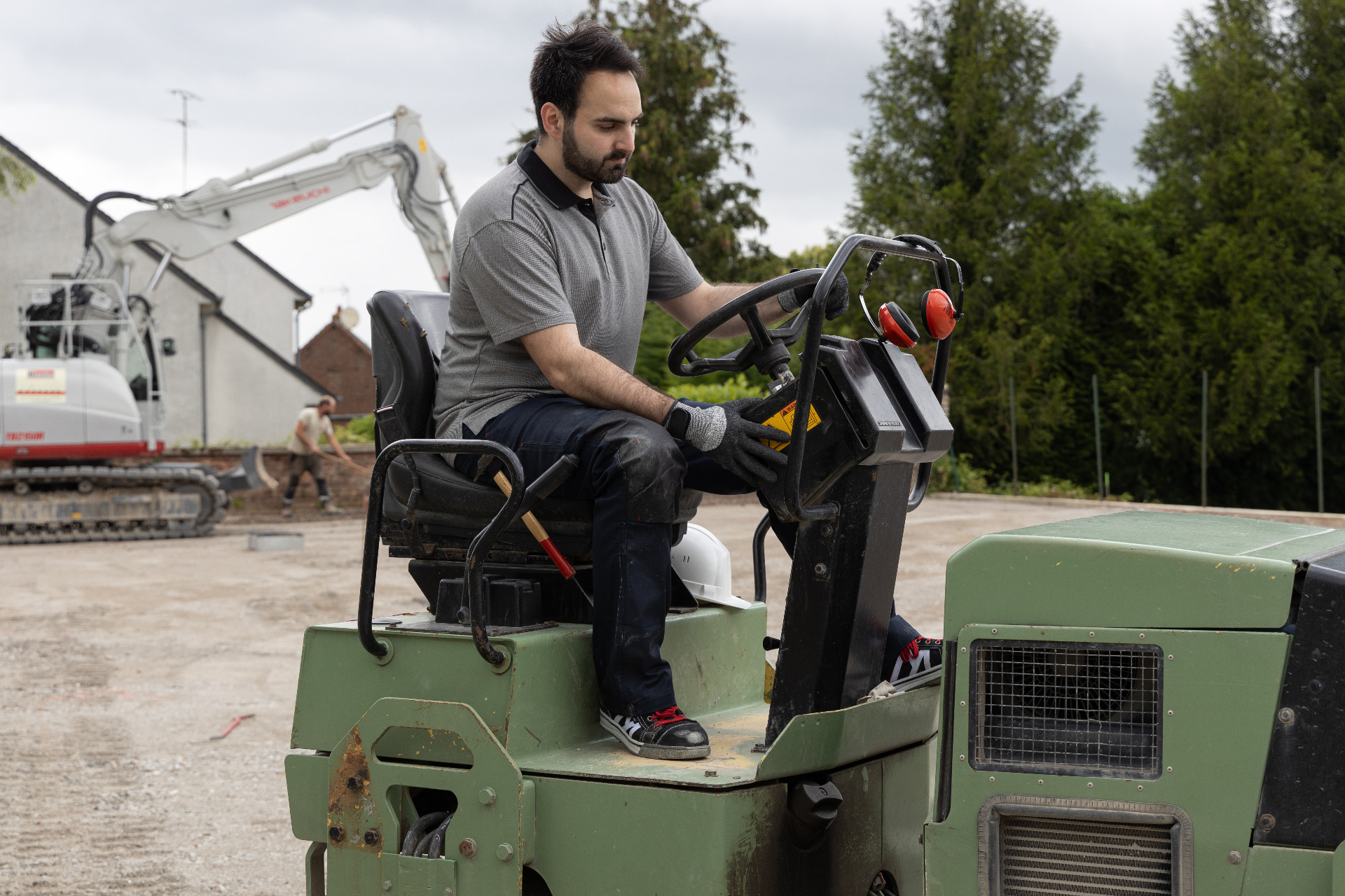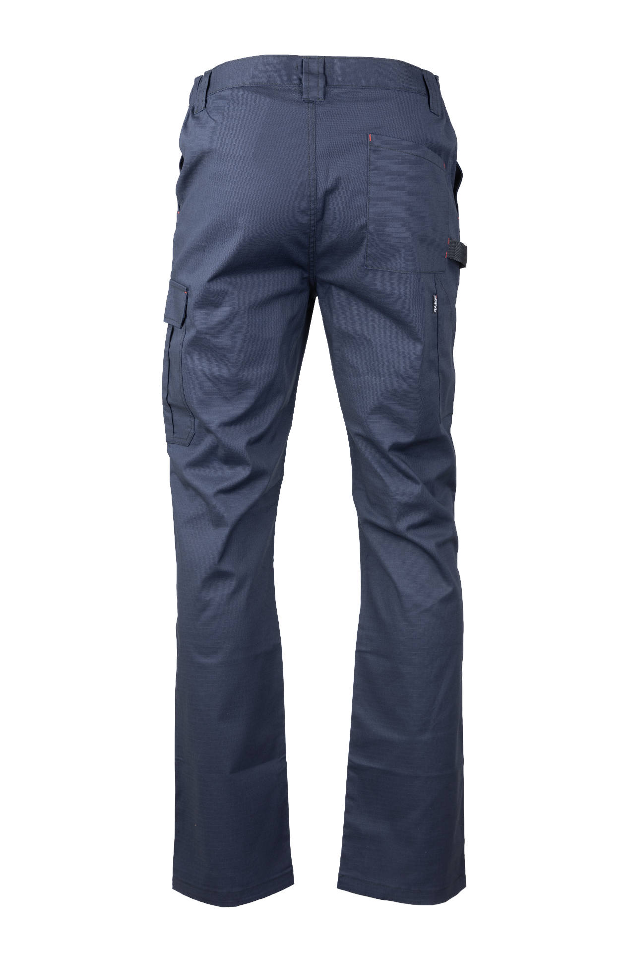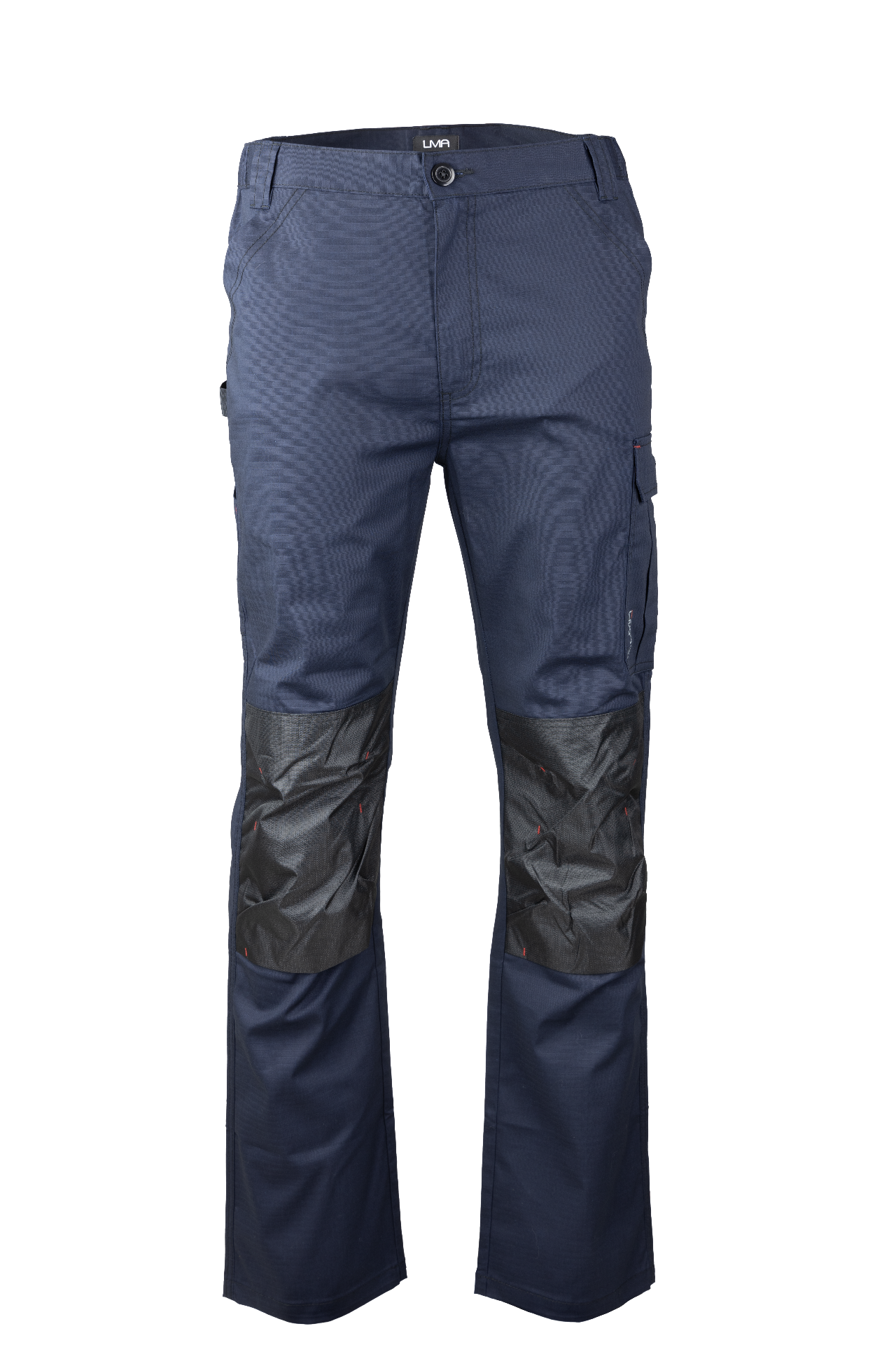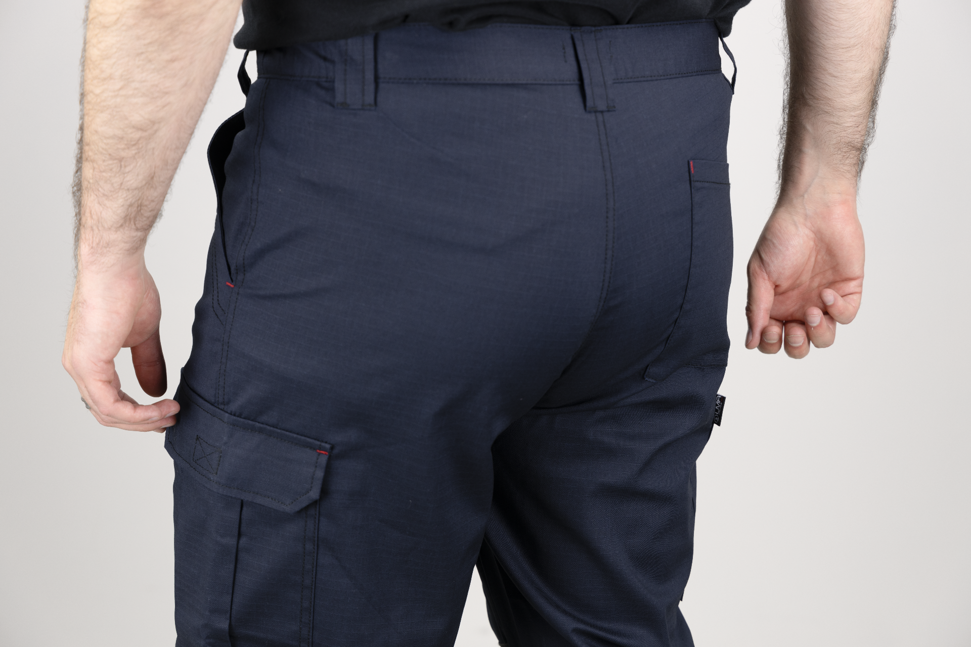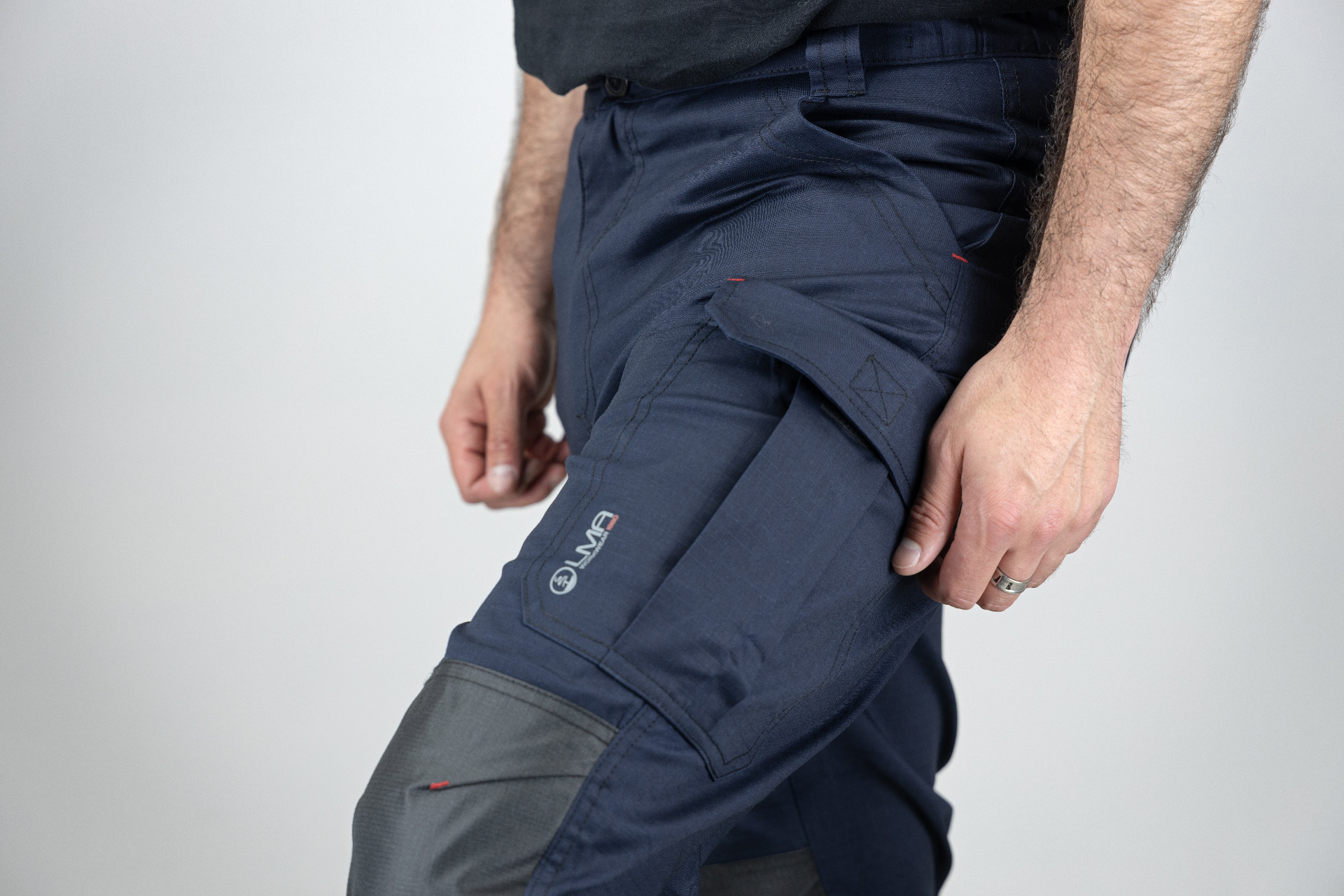 Plastic button 4 holes ⌀ 20mm - Vision zipped fly - Belt with 5 wide loops - Elasticated sides - 5 pockets: Italian pockets - Left thigh pocket with round pleat, closed with flap + magic tape - Patched pocket on back right side - Ruler pocket - Hammer carrier - 1 position knee pockets in Oxford 150D with volume - Contrasting red bartacks - Transfer on thigh pocket