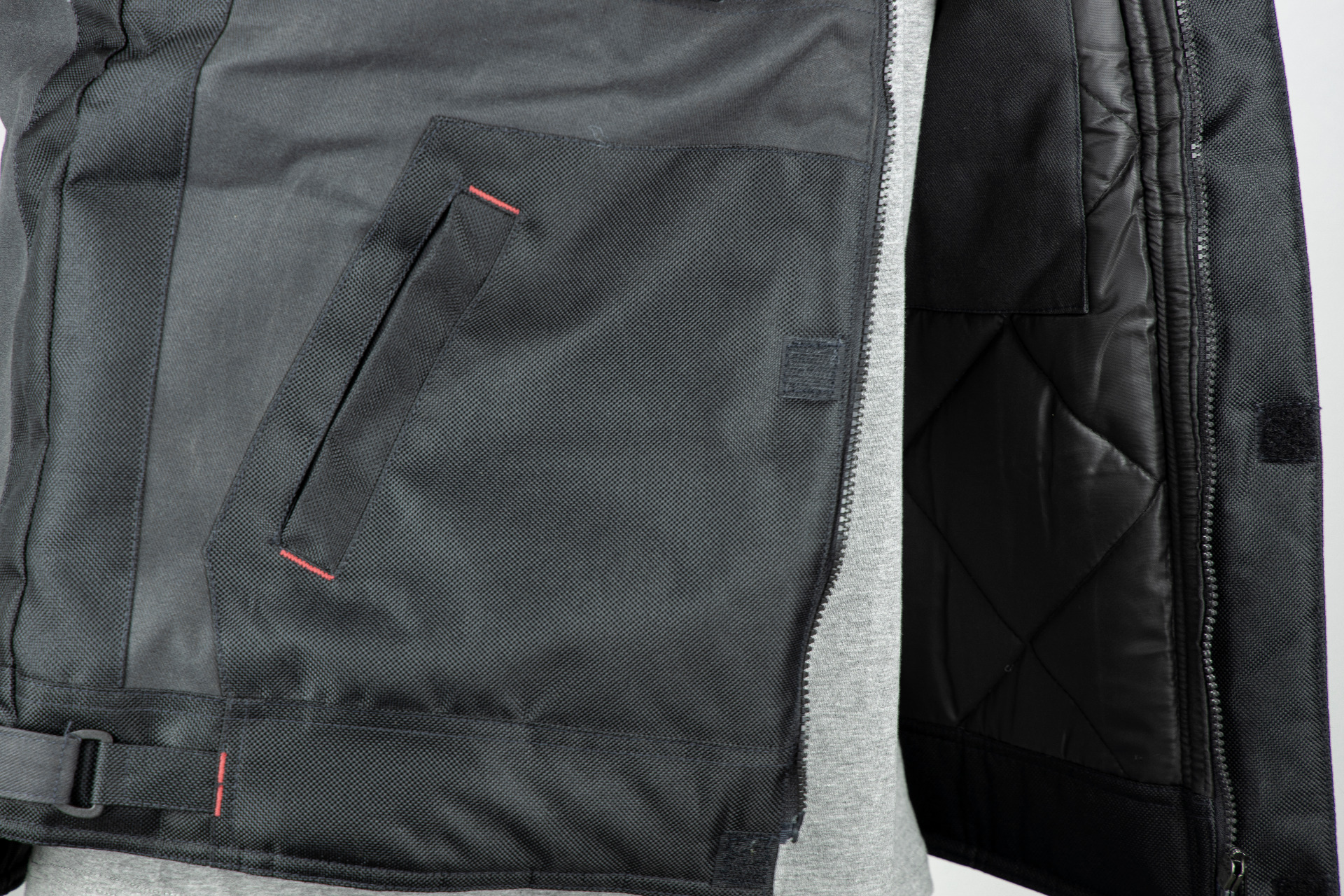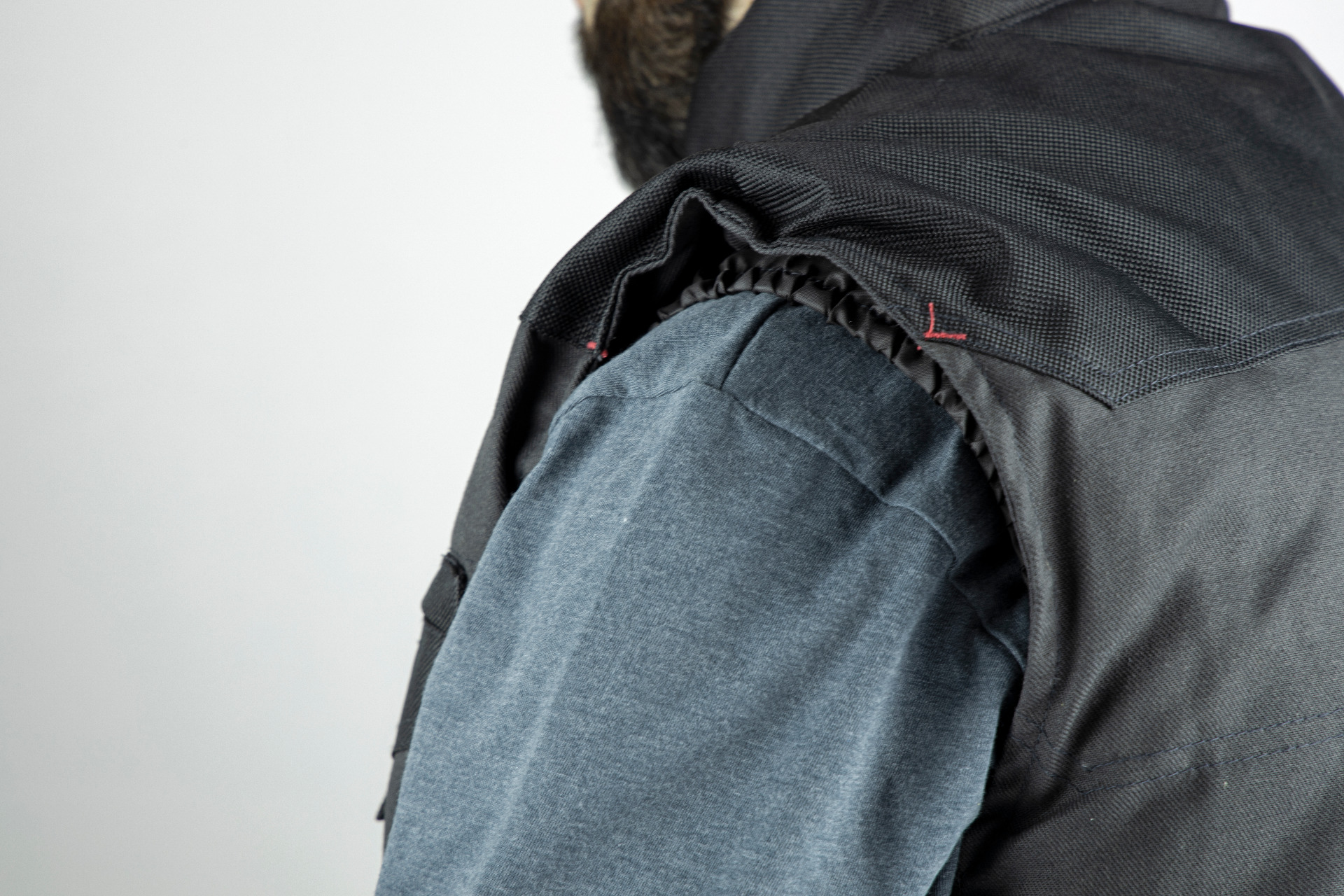 High collar - Elastic armholes - Front zip fastening - Left side: gusseted zipped chest pocket - Right side: 1 chest pocket with velcro flap + retractable badge holder + grommet for earphones - 1 inside chest pocket = 2 handwarming pockets - Reinforced yokes waterproof 900D Oxford yokes - Tightenable belt with velcro on sides - Longer back - Loop on the back to hang the garment - Original overstitched pattern