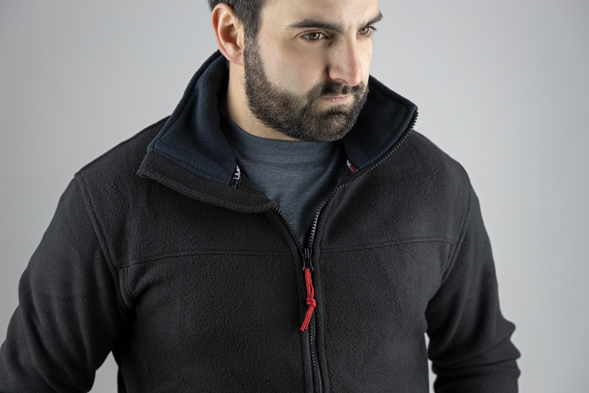 High collar - Inner collar - Red contrast drawstring zipper - Lower zippered pockets - Flatlock and stitching on front and back - Long sleeves