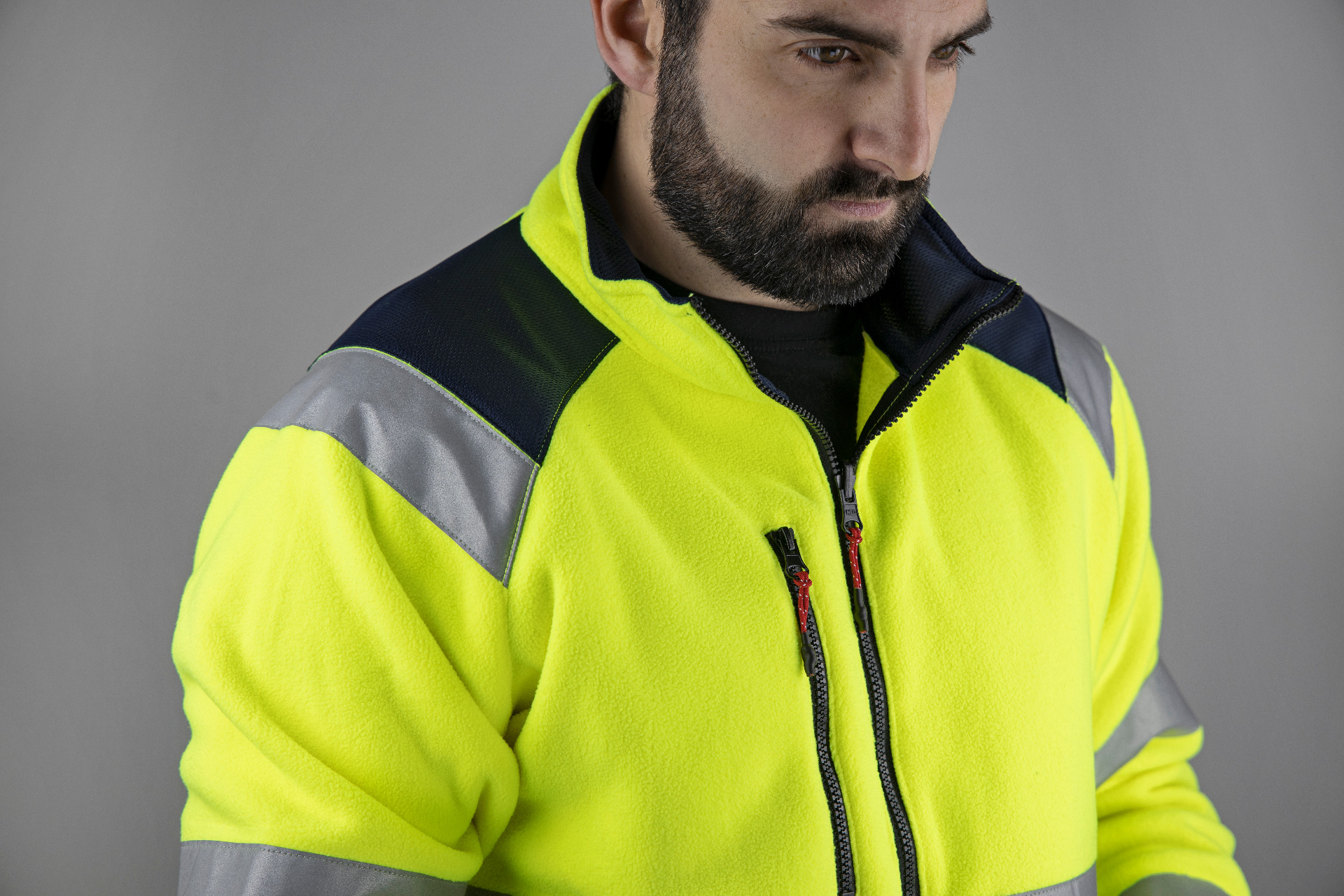 zipped pockets - 2 inches full reflective tapes sewn on - Contrasted yokes on shoulders, body