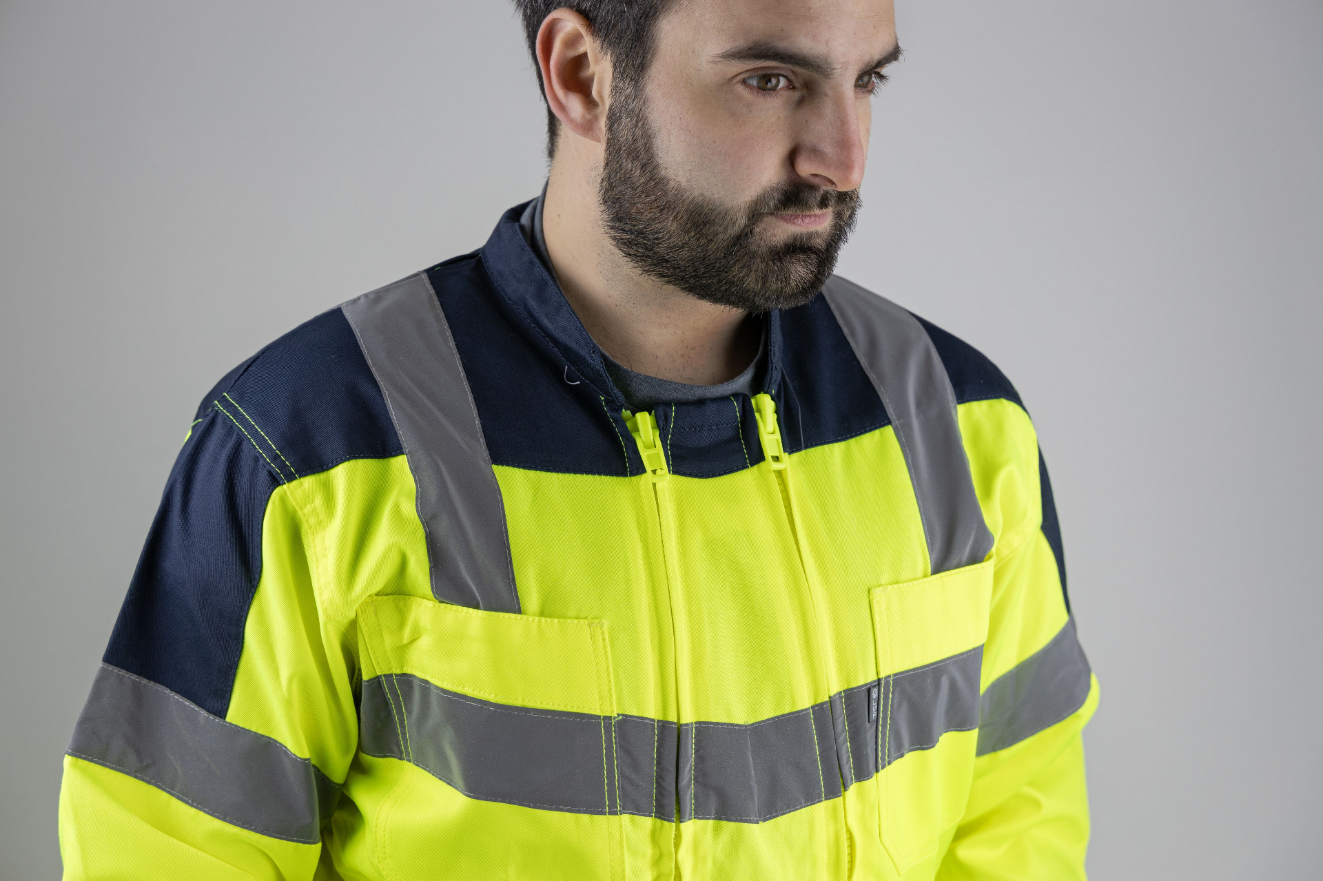 High collar - 2 chest pockets - 2 Italian pockets - 1 back pocket - Elastic sides - 2 inches reflective tapes - Metal free