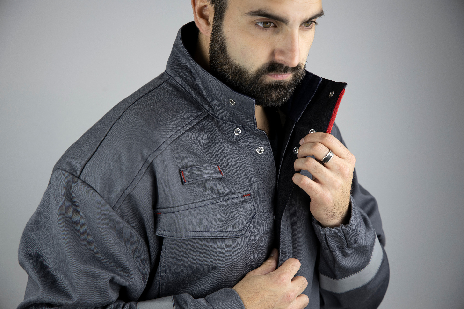 reflective tapes - ATEX area transfer on left sleeve - Contrasted red bartacks