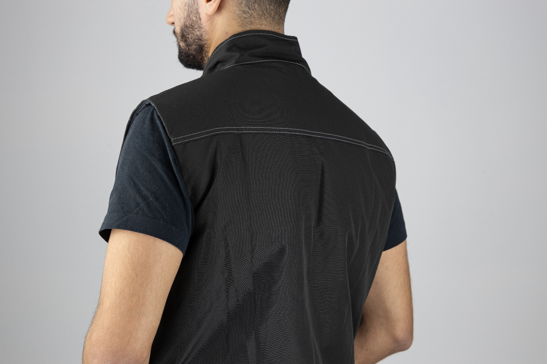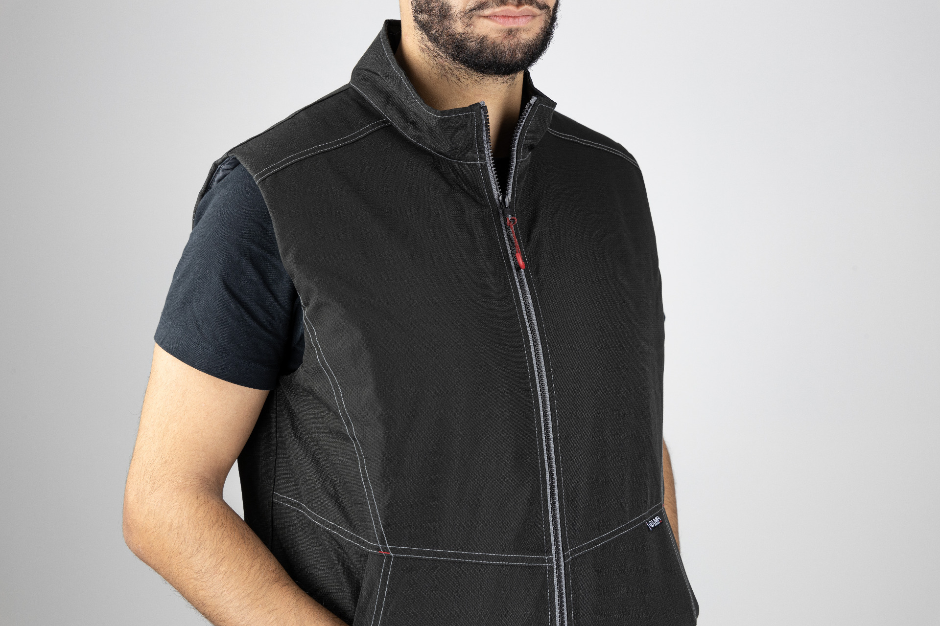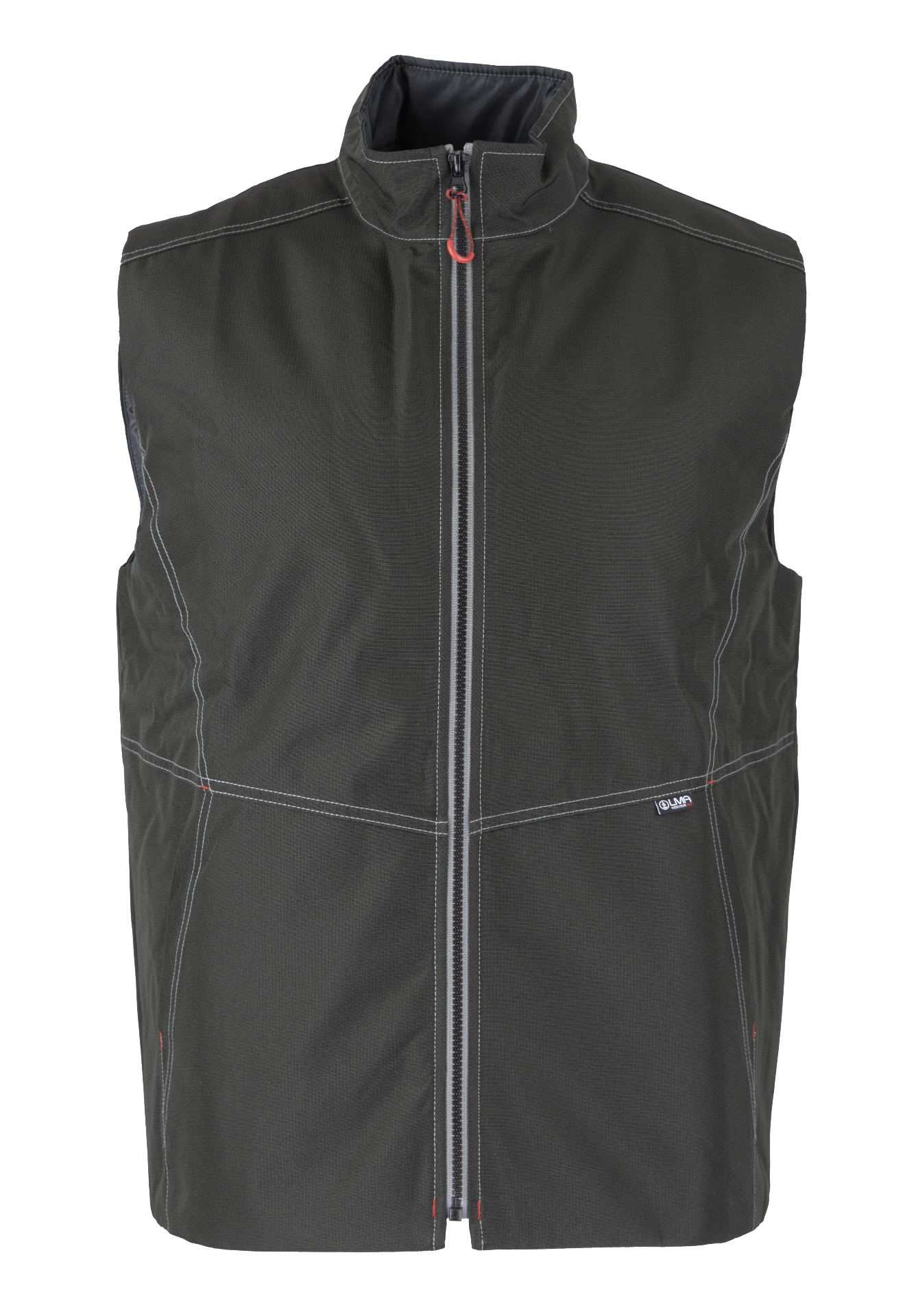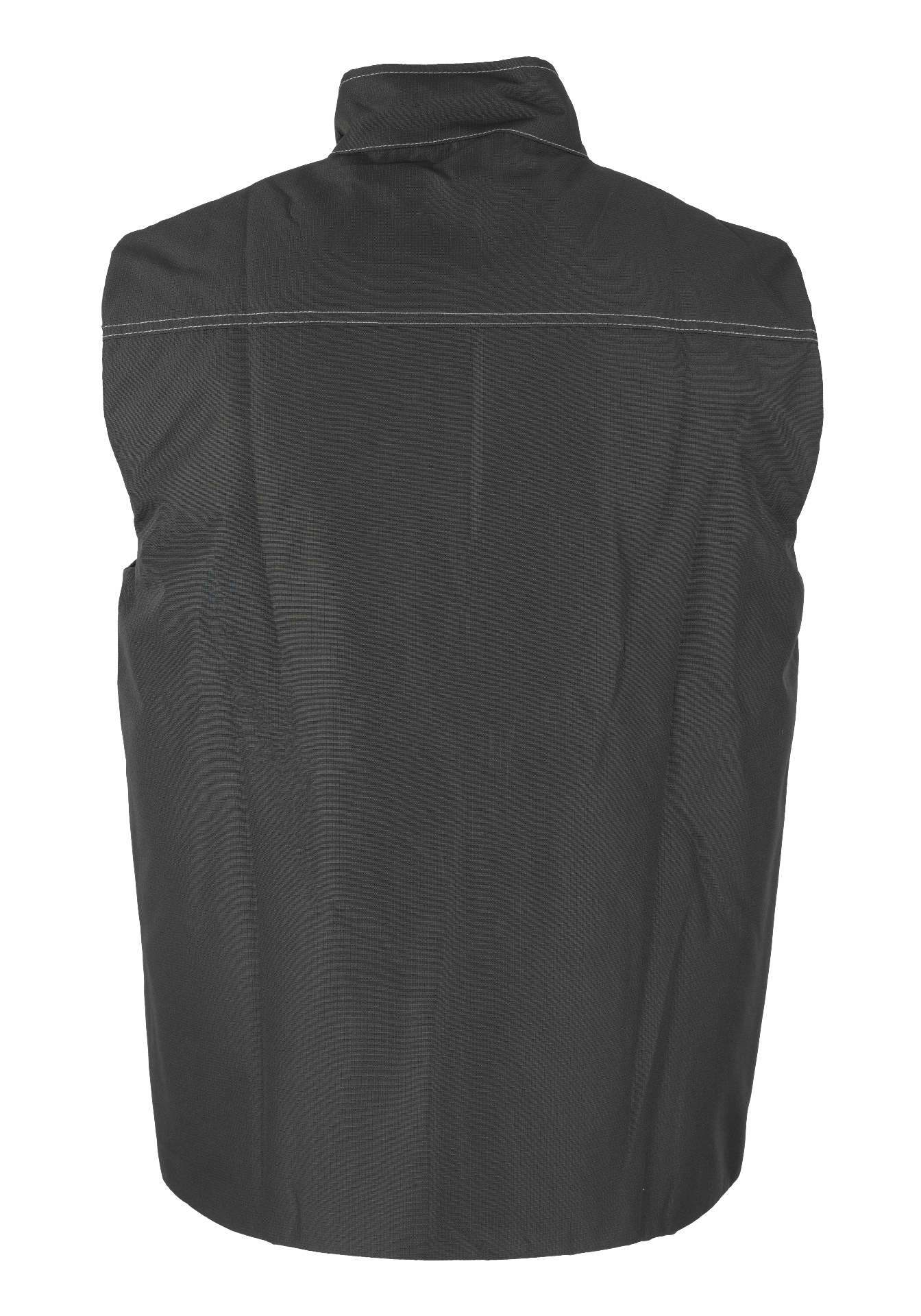 Padded Bodywarmer - High collar - Closed by grey plasstic zipper - Shoulder and backyokes - 3 pockets - 1 inner pocket closed by magic tape - 2 kangaroo pockets - red bartacks - Contrasting stitching