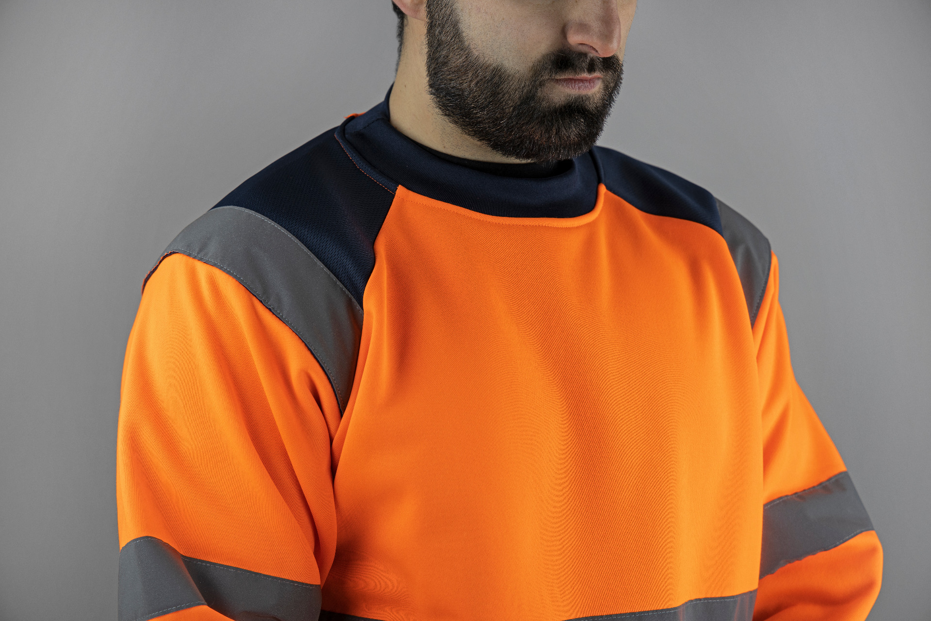 Rib knitted round collar - Rib knitted cuffs - Rib bottom - Contrasted yokes on shoulders, sleeves and body bottoms -2 inches reflective tapes sewn - Raglan