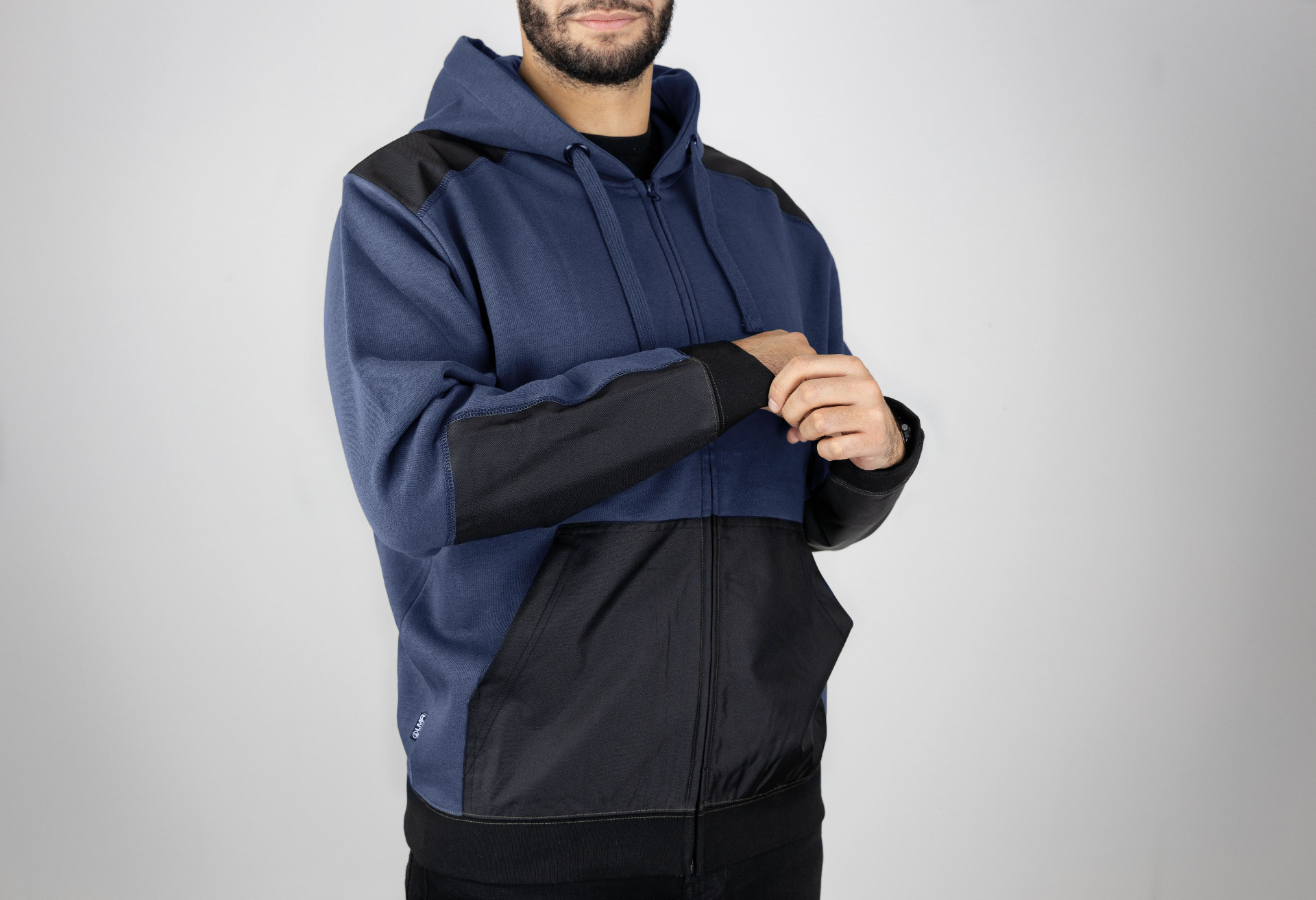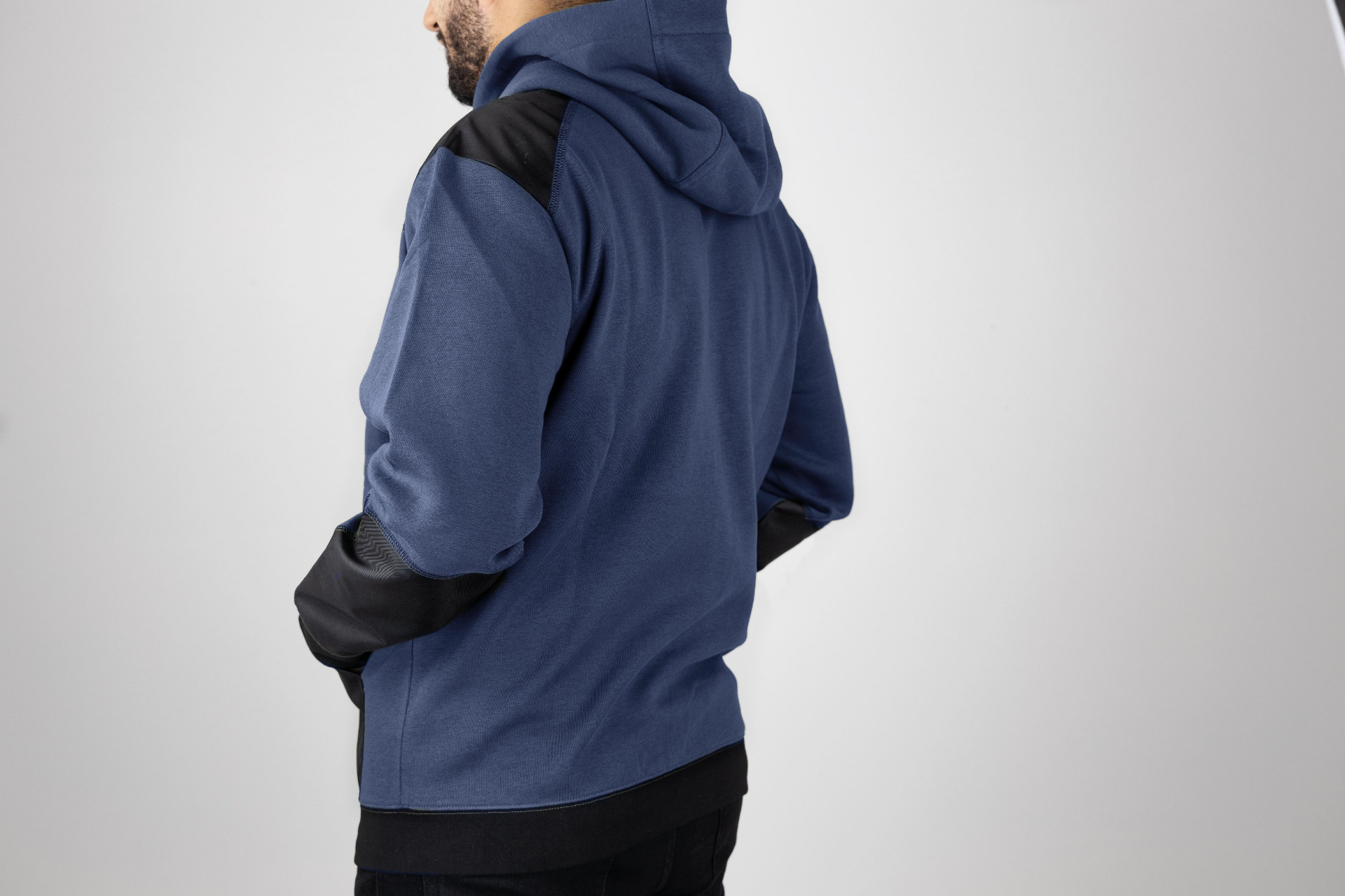 Unlined hood adjustable cord - Closed by plastic vision zipper - Rib on body and sleeves bottom - 2 Oxford reinforced kangaroo pockets - Tone/tone bartacks - 300D Oxford shoulders and under sleeves reinforcements