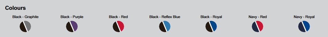 Colours: Black/Graphite, Black/Purple, Black/Red, Black/Royal Blue, Black/Reflex Blue, Navy/Red, Navy/Royal Blue