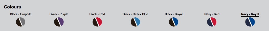 Colours: Black/Graphite, Black/Purple, Black/Red, Black/Reflex Blue, Black/Royal, Navy/Red, Navy/Royal