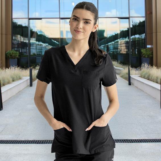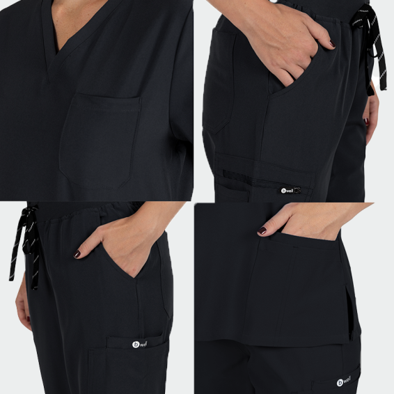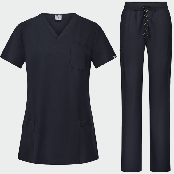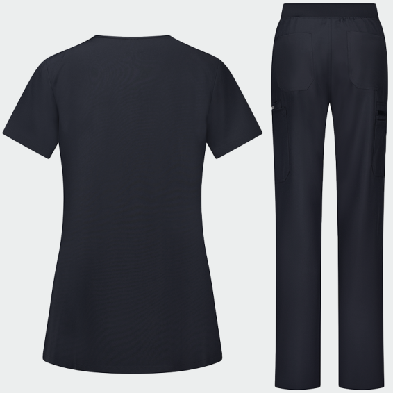 Elegant women's set made of ethereal fabric, a blend of 94% polyester and 6% spandex. The tunic has short sleeves, a V-neckline and side slits. It has a small upper pocket and two bottom ones, the right one is a double pocket with a pen compartment. The trousers have a comfortable and modern look. Wide elasticated waist and tie for extra fastening. Multiple pockets for maximum convenience and comfort.