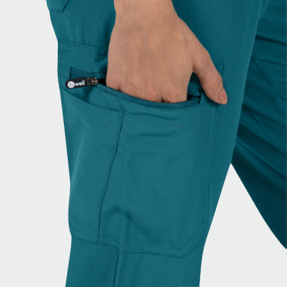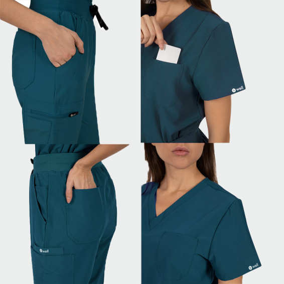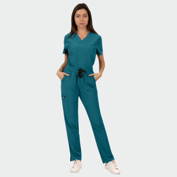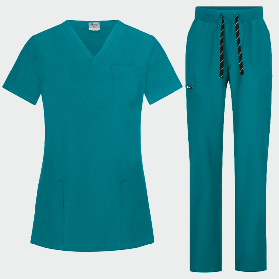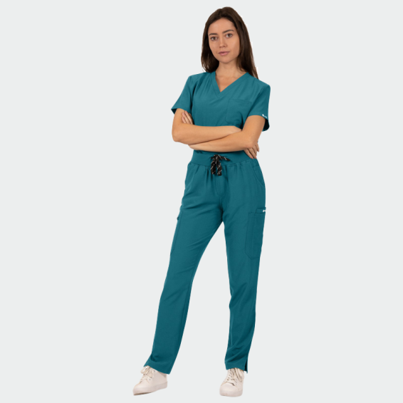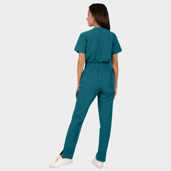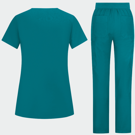 Elegant women's set made of ethereal fabric, a blend of 94% polyester and 6% spandex. The tunic has short sleeves, a V-neckline and side slits. It has a small upper pocket and two bottom ones, the right one is a double pocket with a pen compartment. The trousers have a comfortable and modern look. Wide elasticated waist and tie for extra fastening. Multiple pockets for maximum convenience and comfort.