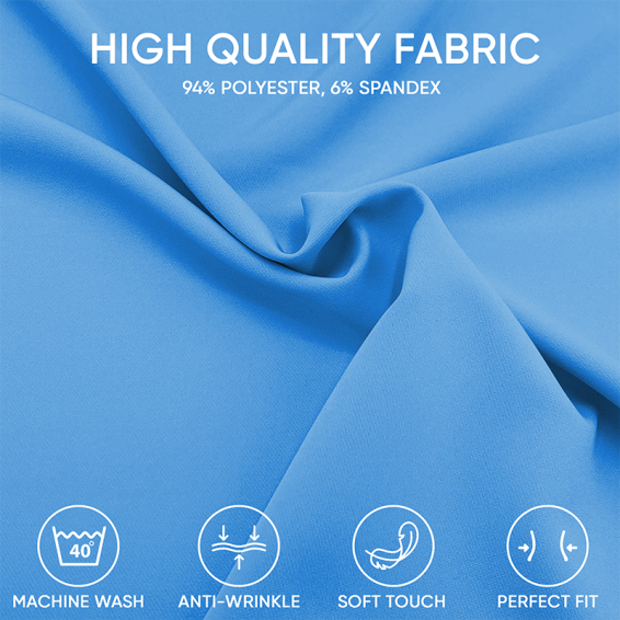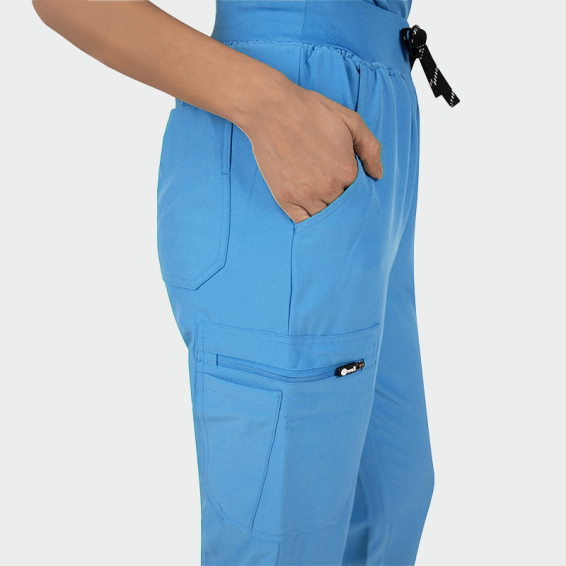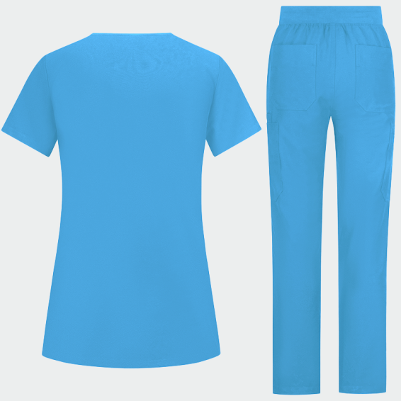 Elegant women's set made of ethereal fabric, a blend of 94% polyester and 6% spandex. The tunic has short sleeves, a V-neckline and side slits. It has a small upper pocket and two bottom ones, the right one is a double pocket with a pen compartment. The trousers have a comfortable and modern look. Wide elasticated waist and tie for extra fastening. Multiple pockets for maximum convenience and comfort.