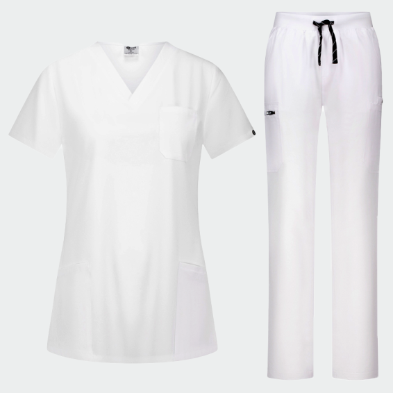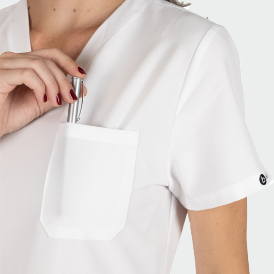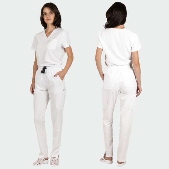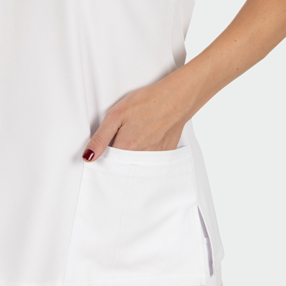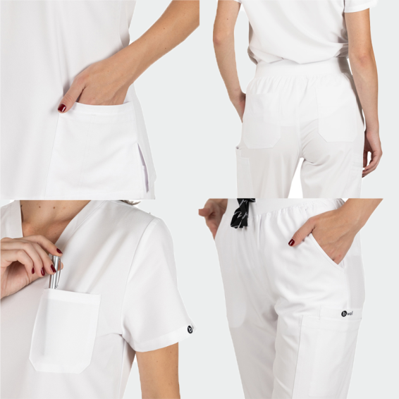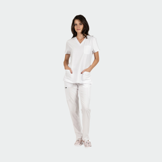 Elegant women's set made of ethereal fabric, a blend of 94% polyester and 6% spandex. The tunic has short sleeves, a V-neckline and side slits. It has a small upper pocket and two bottom ones, the right one is a double pocket with a pen compartment. The trousers have a comfortable and modern look. Wide elasticated waist and tie for extra fastening. Multiple pockets for maximum convenience and comfort.