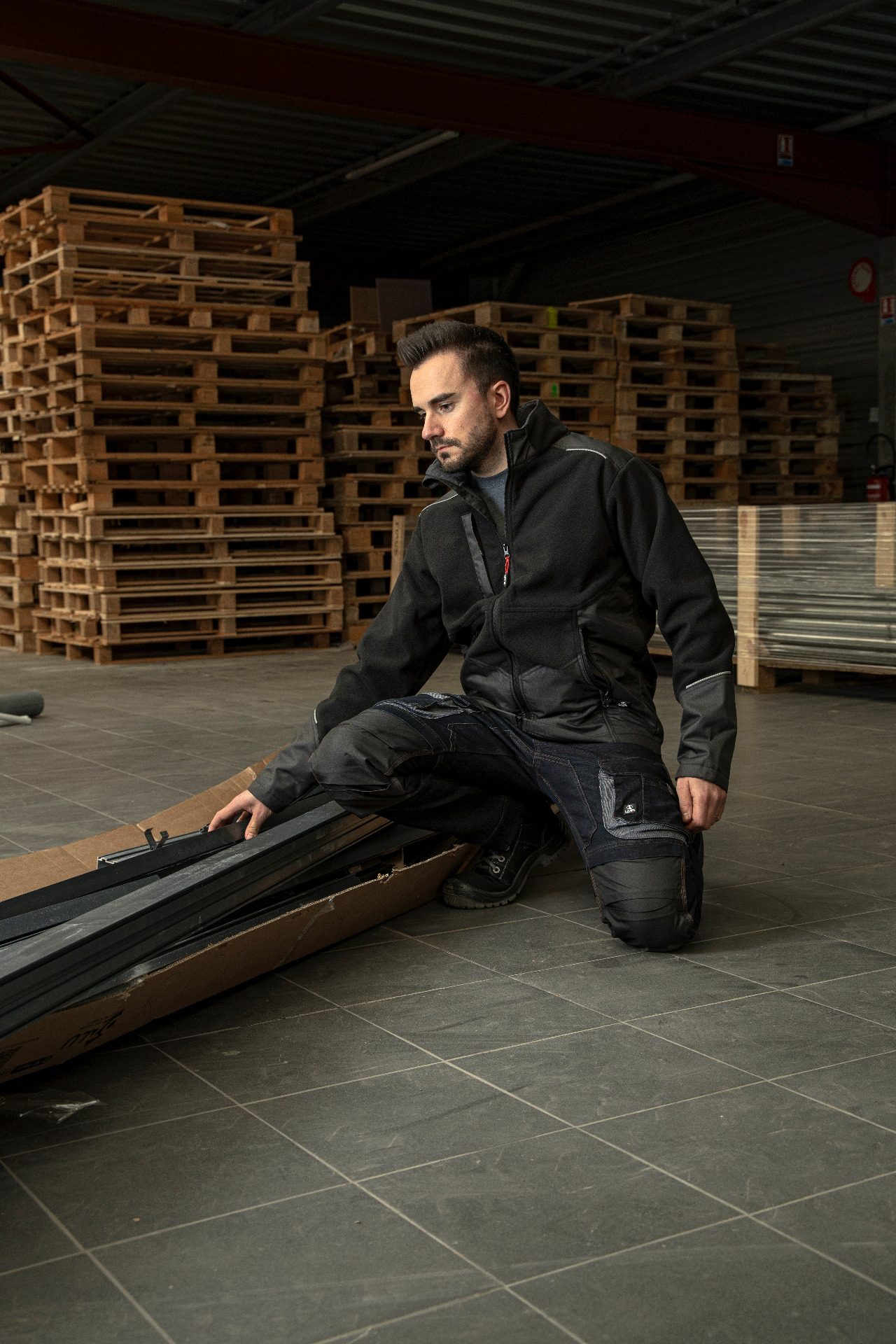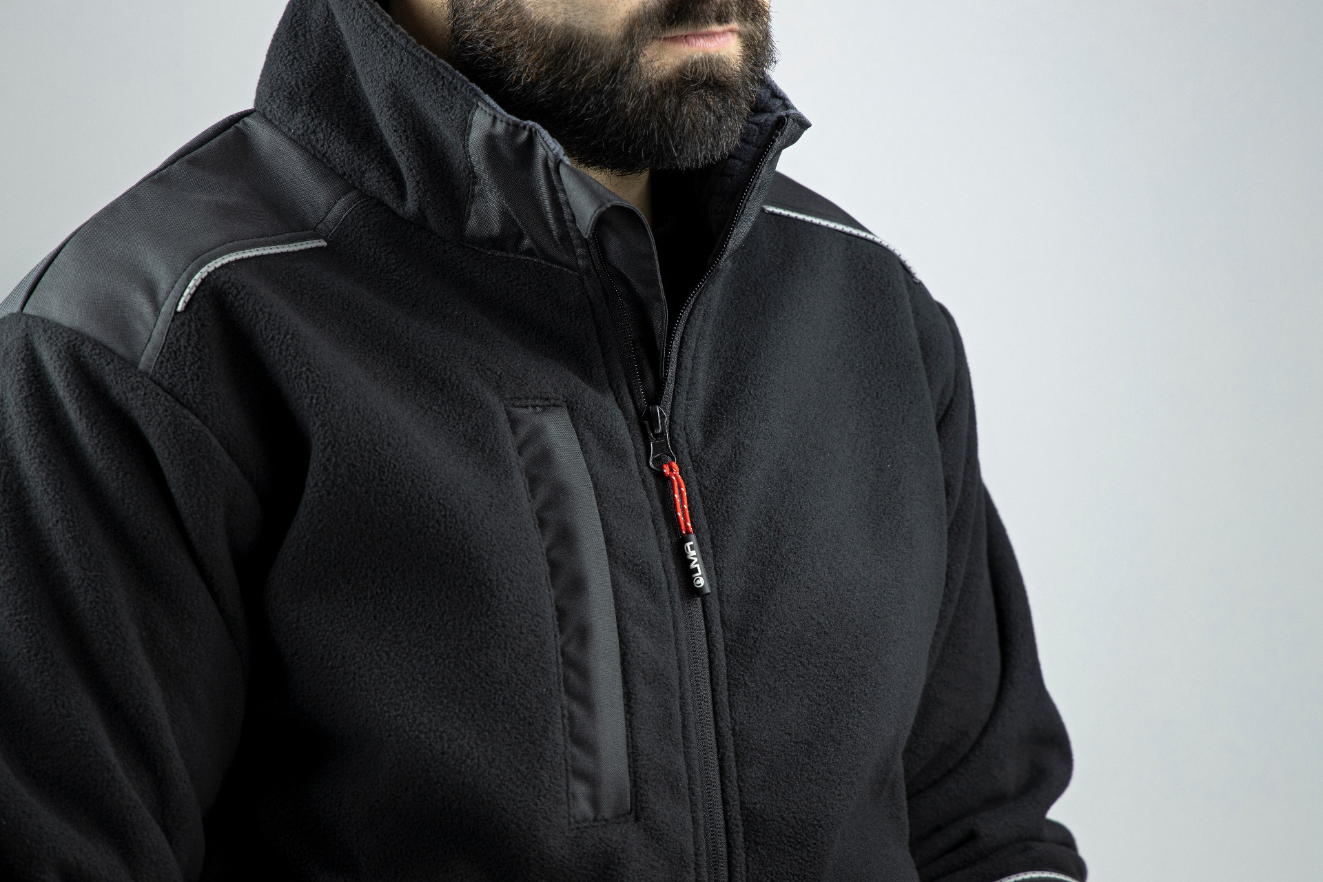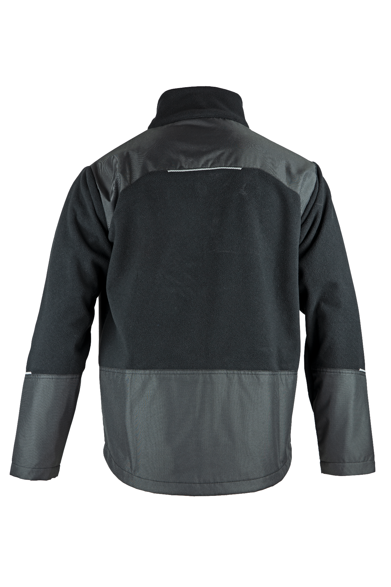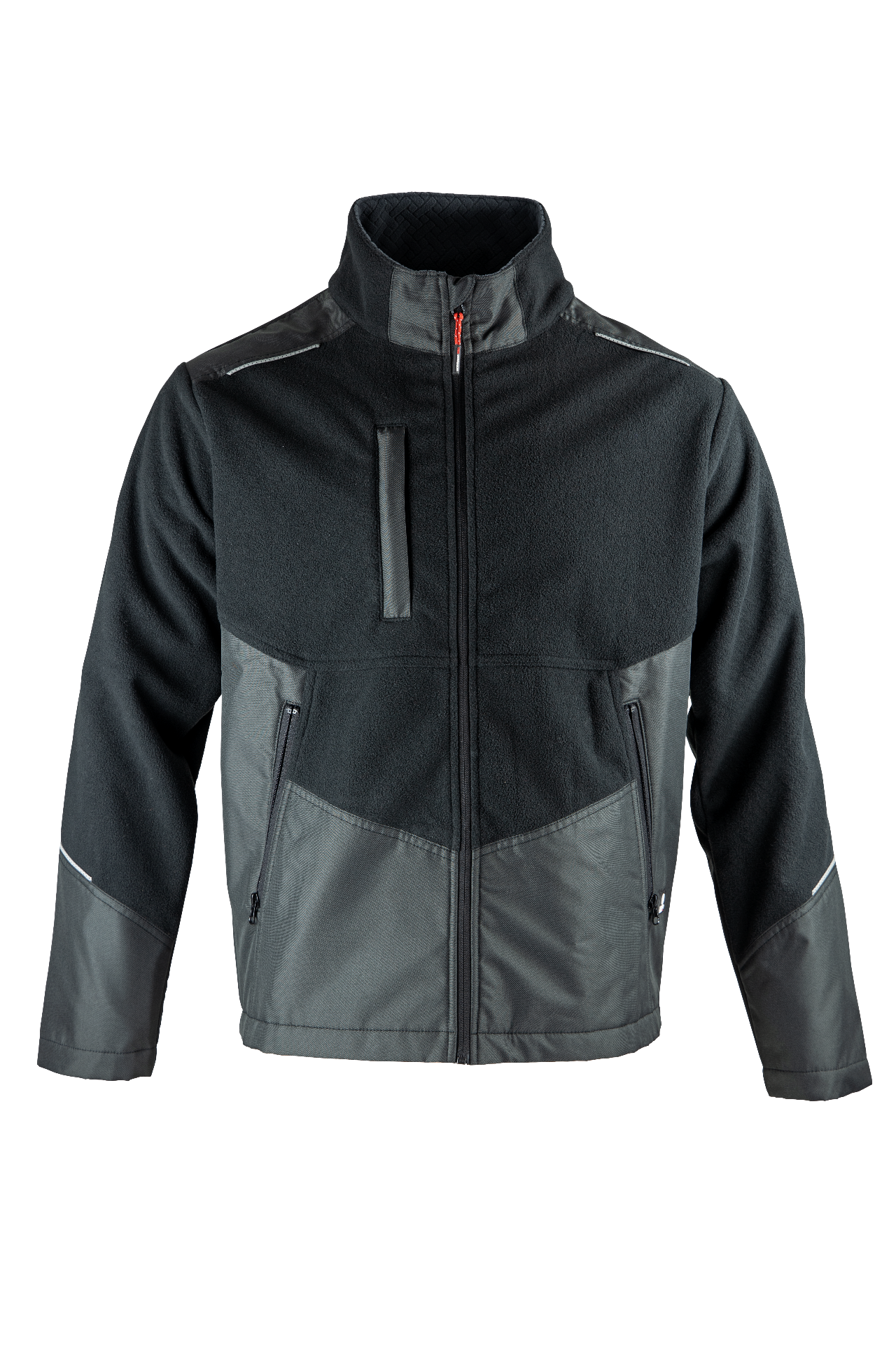 Polar fleece jacket with TPU film, textured innerside - High collar (higher on back) - Waterproof Oxford 300D yokes on shoulders - Reflective perforated piping - Closed with zipped & necktape - One chest zipped pocket underneath flap - Two lover zippered wide pockets with Oxford reinforcement yokes - Two lower inner pockets - Reinforcement yokes on sleeves bottom & perforated reflective piping - Raised lower back
