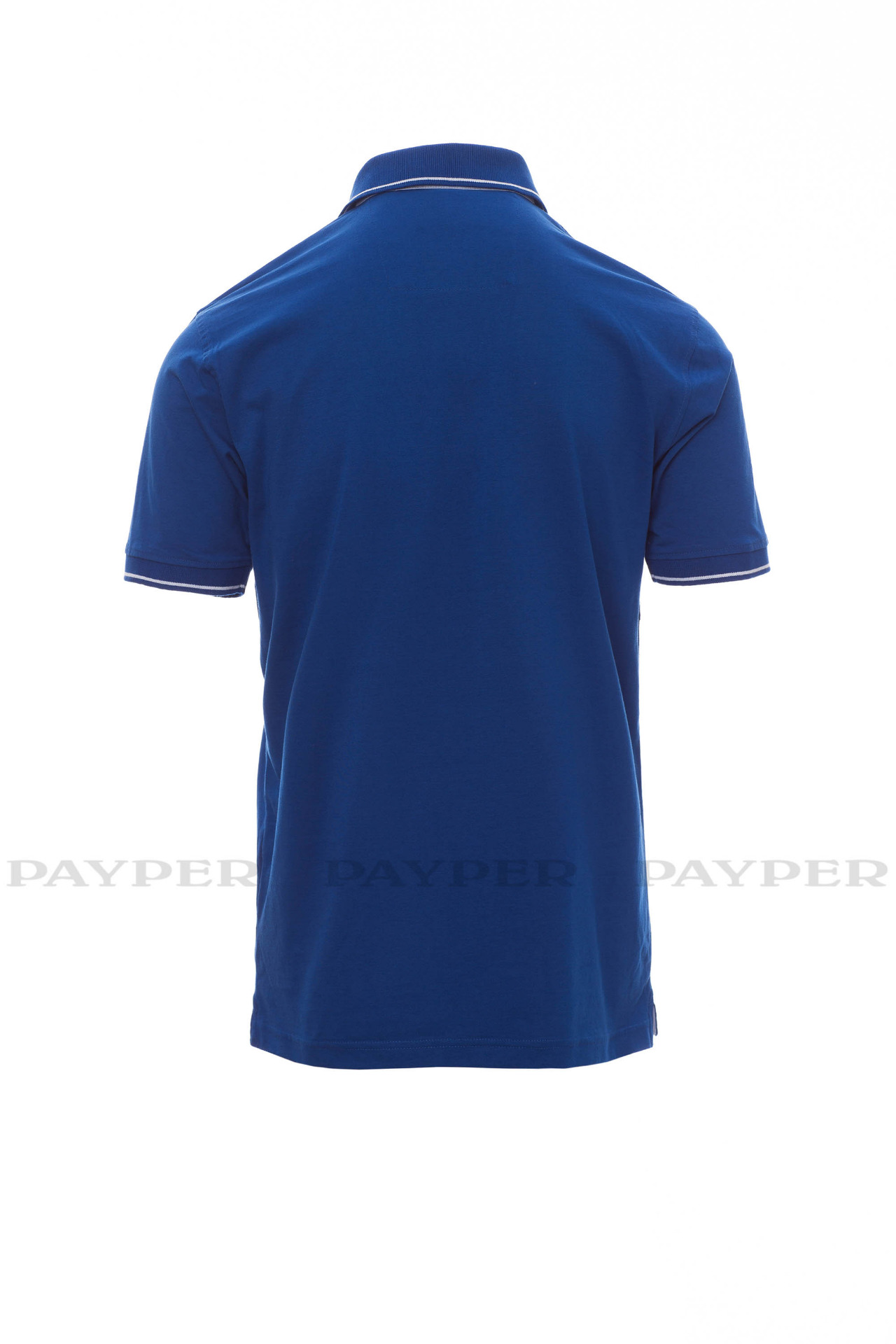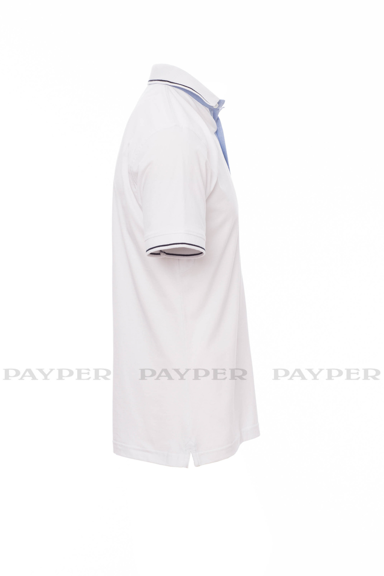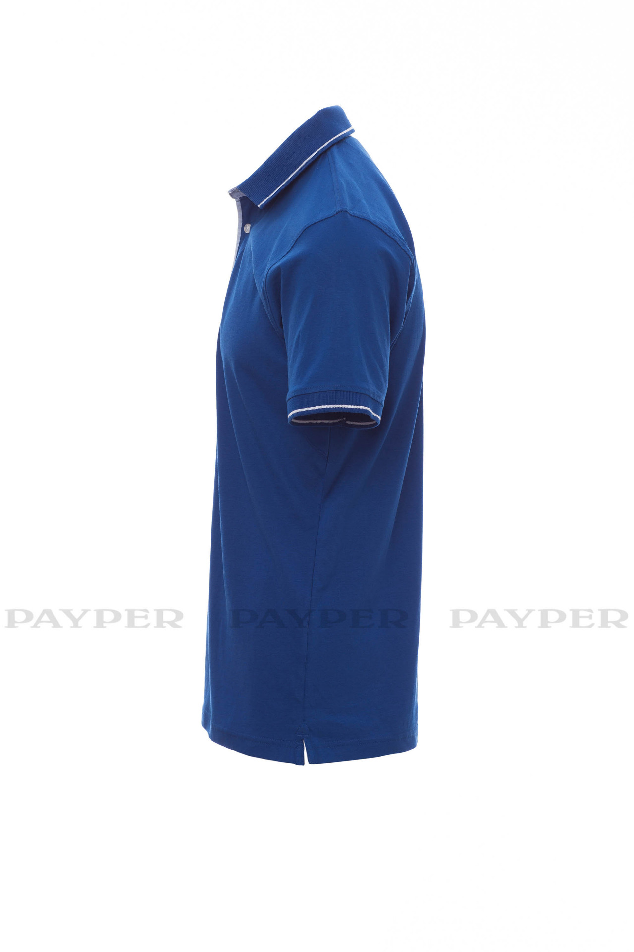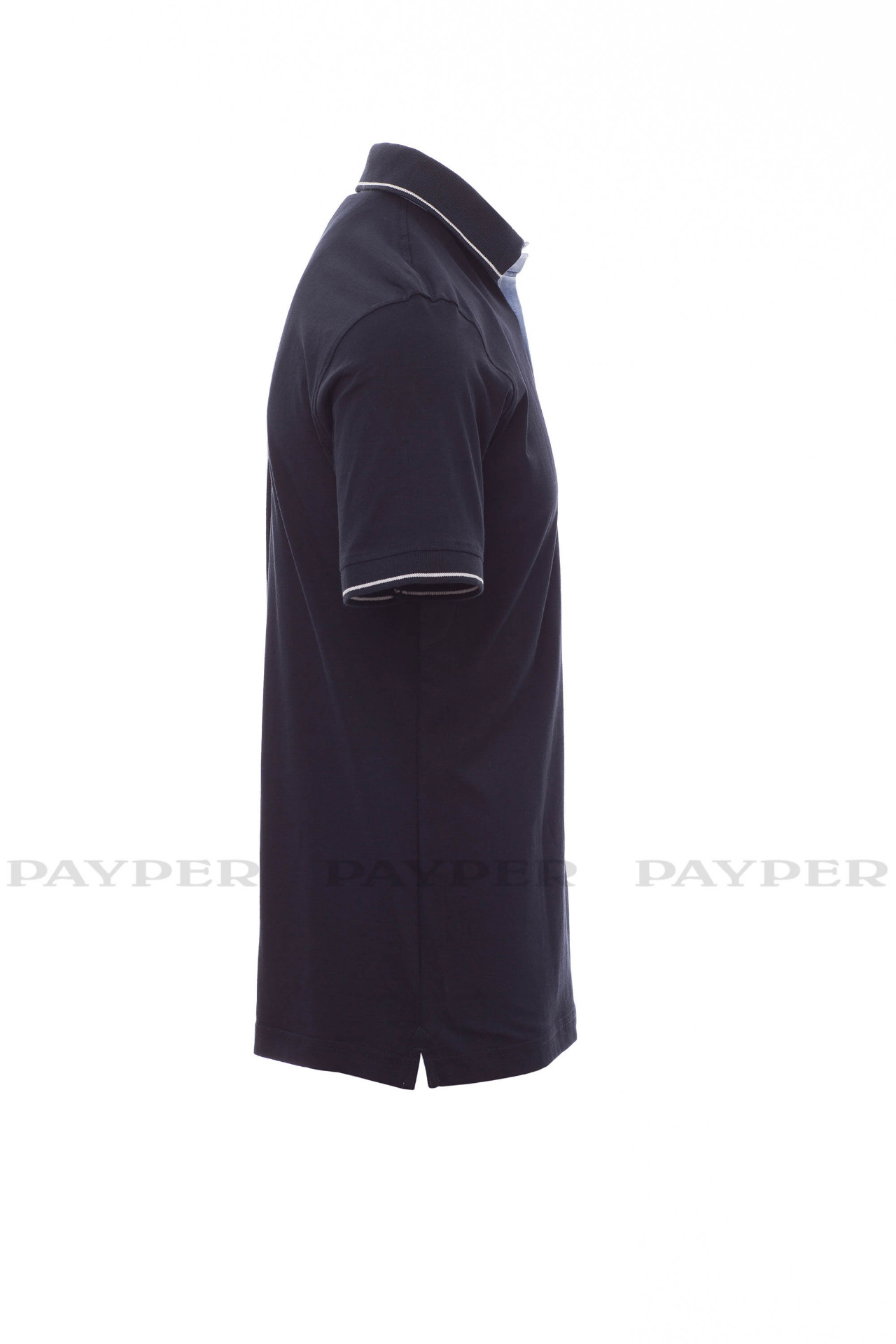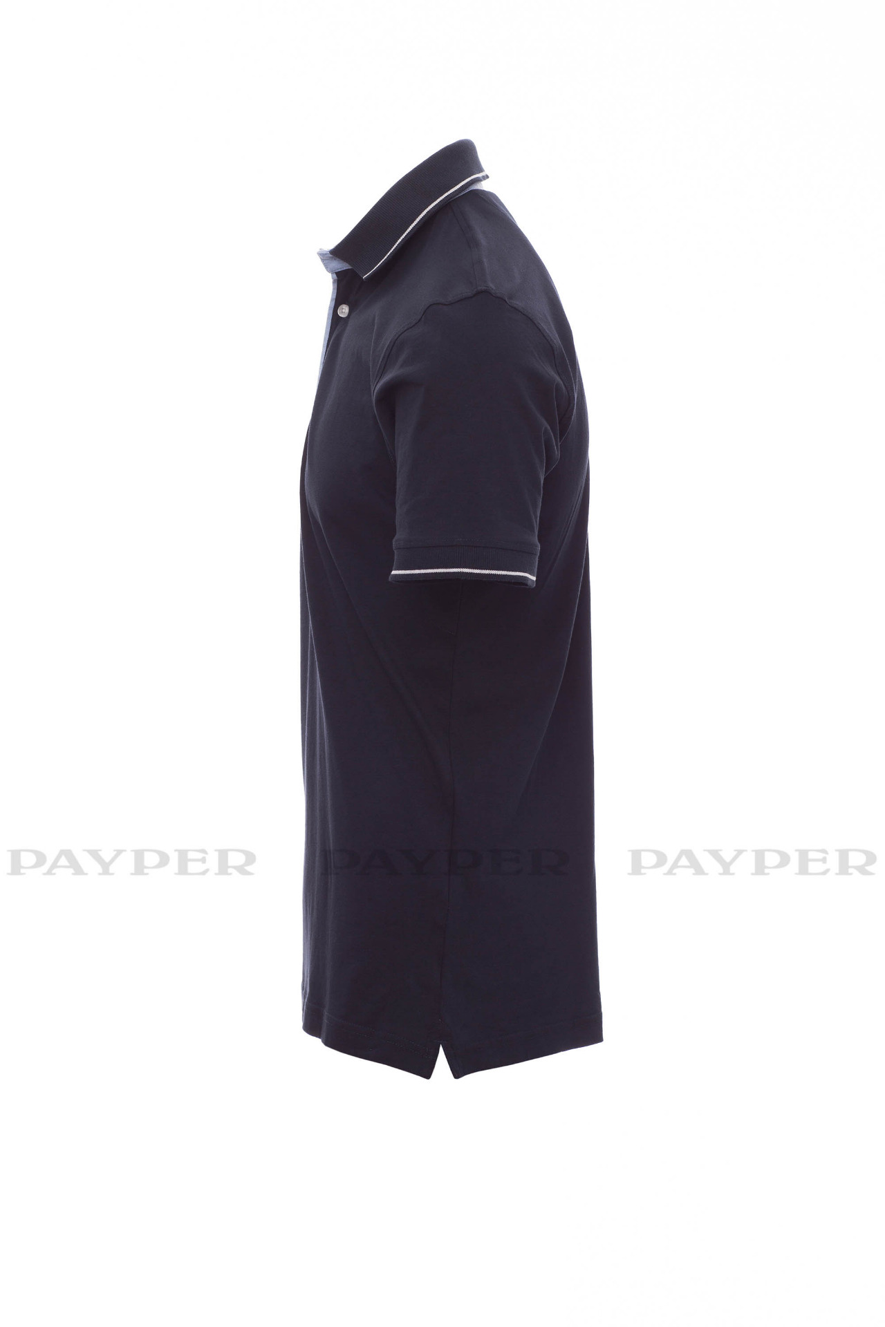 and side vents in Oxford blue, rib collar and sleeve edging with fine