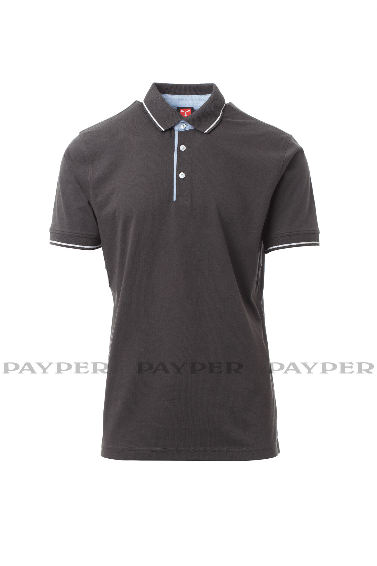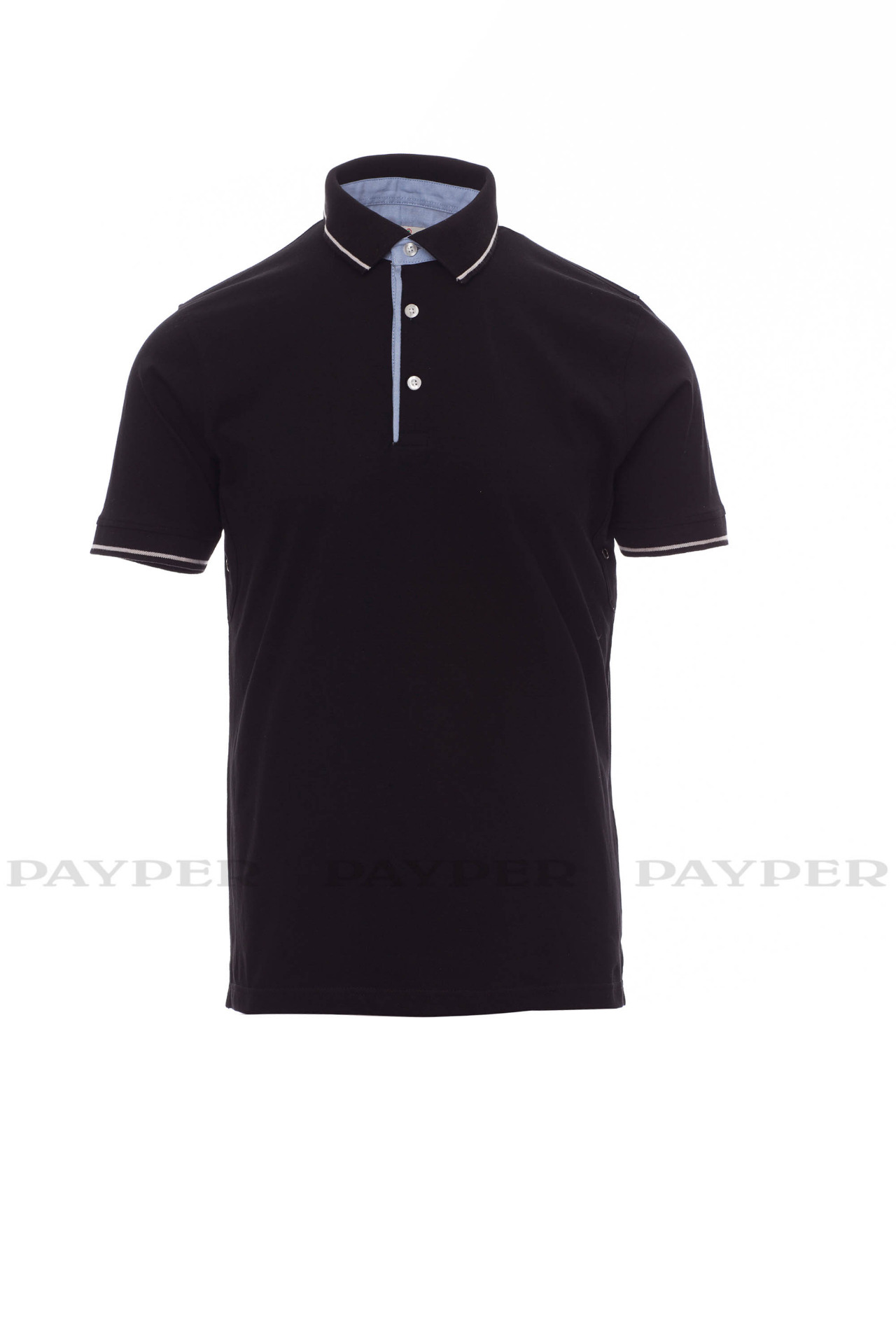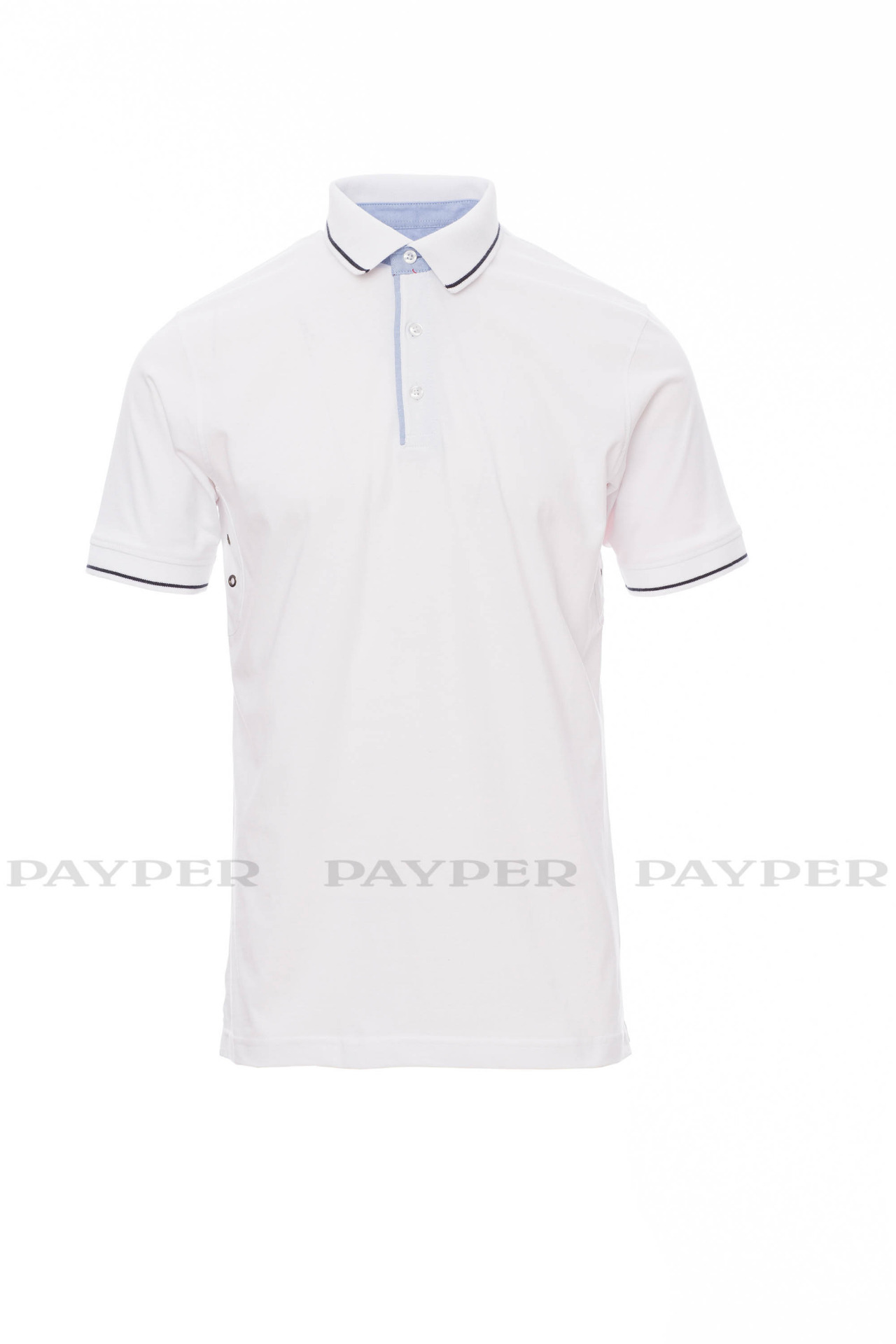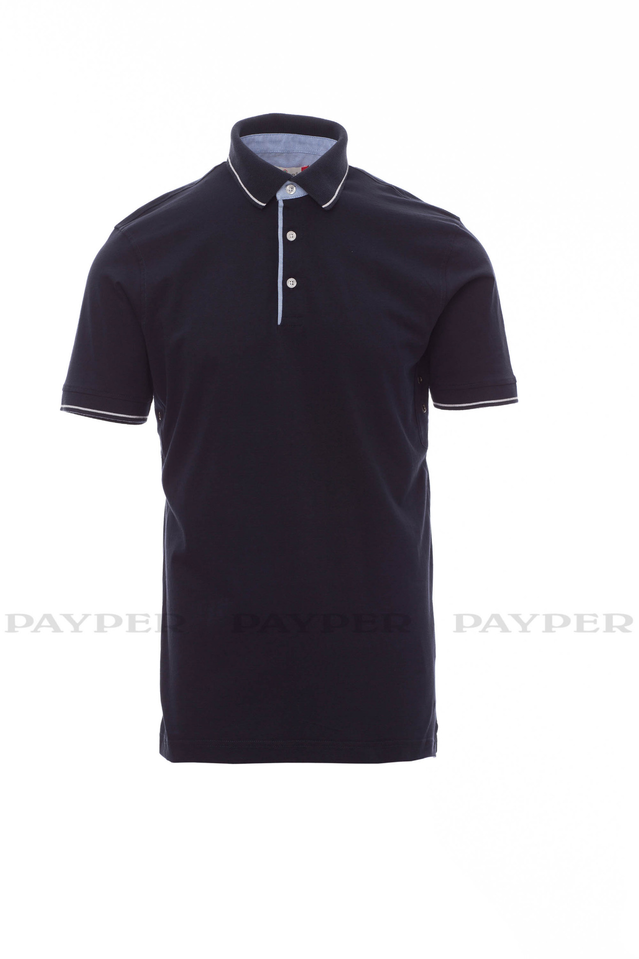 Men's short-sleeved polo shirt with 3 white buttons, inside collar, flap