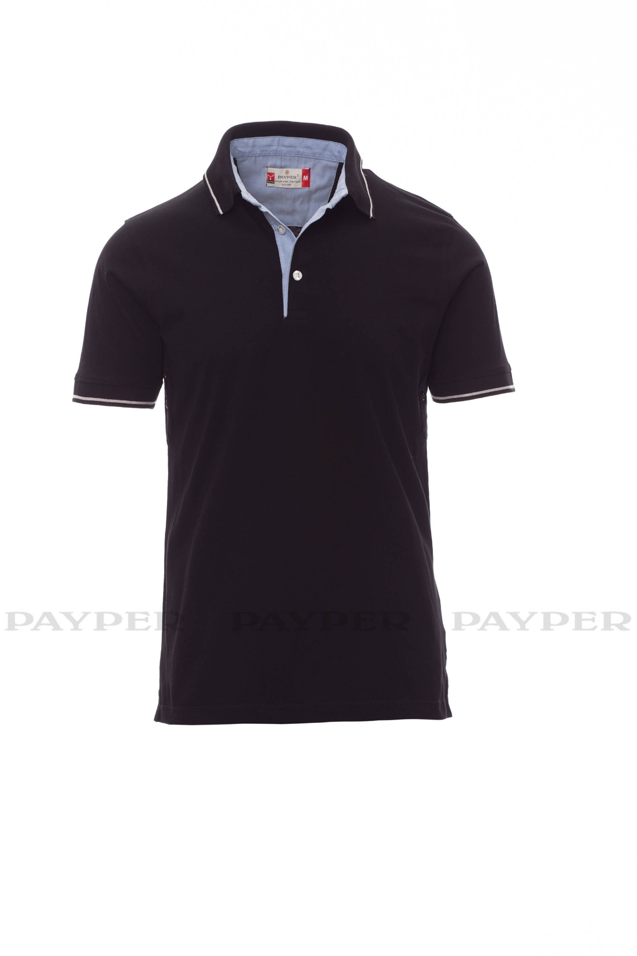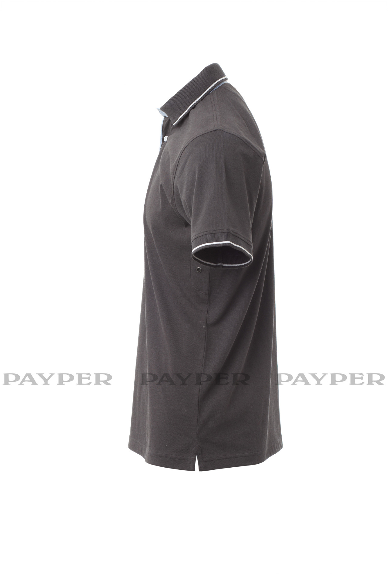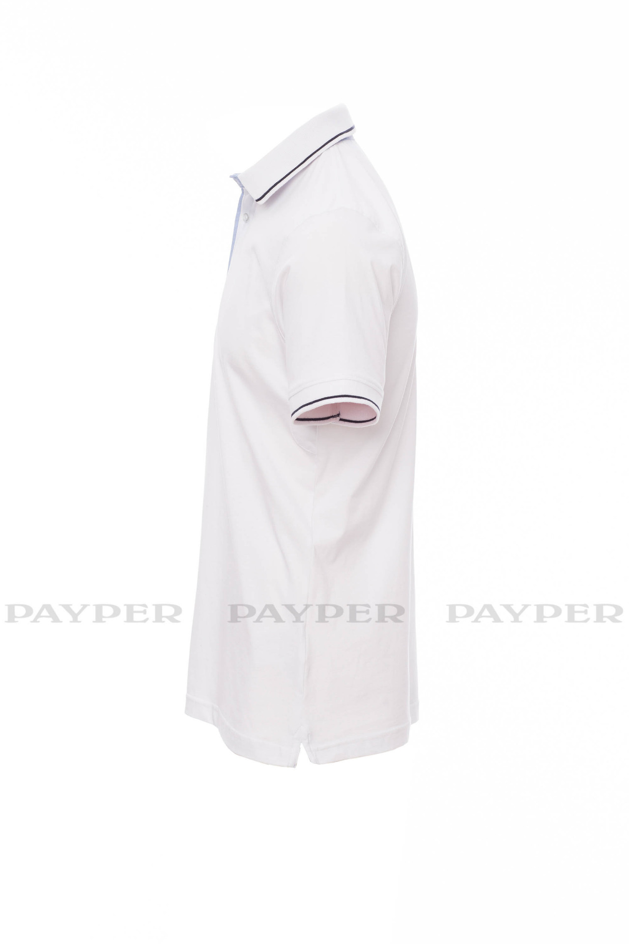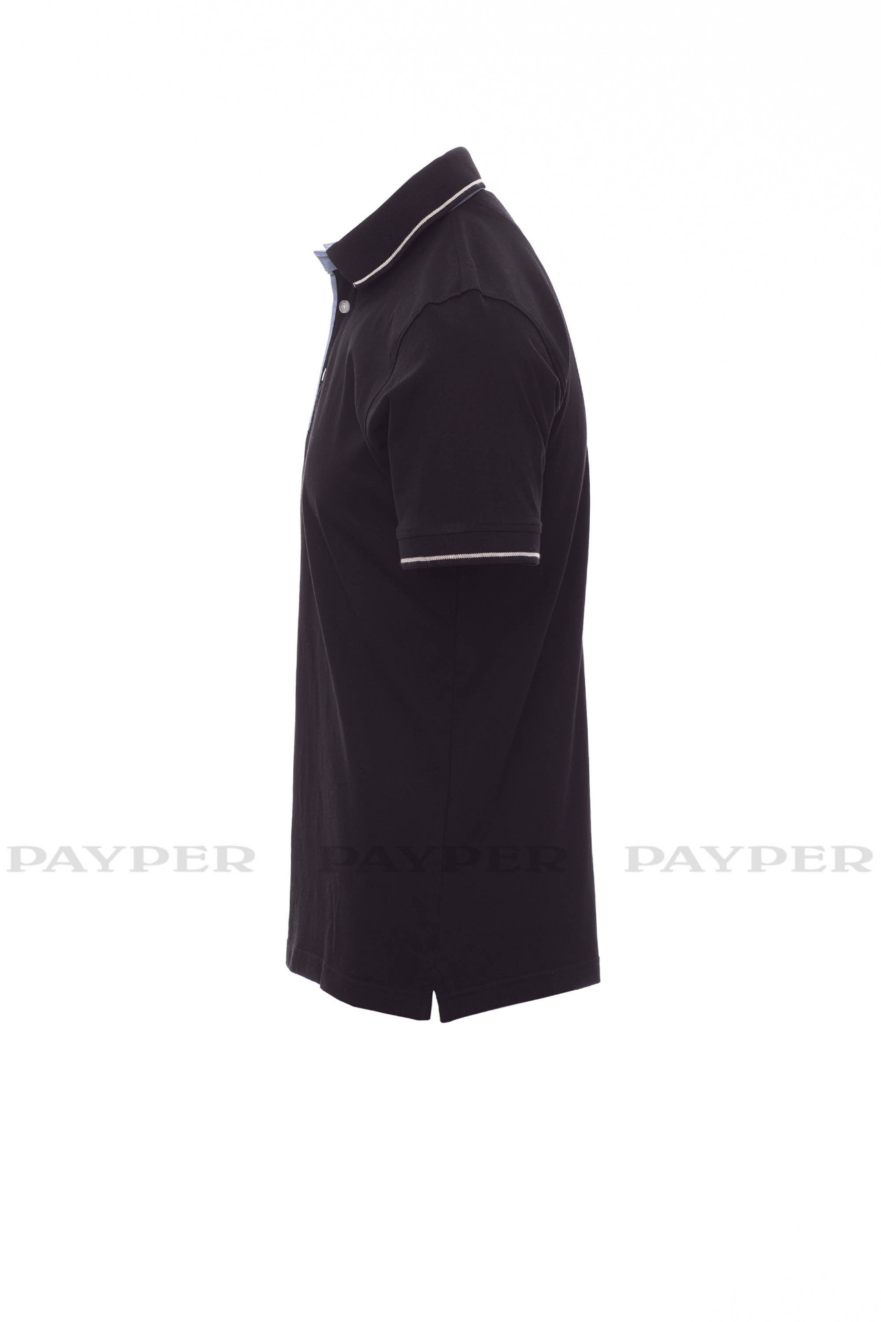 Men's short-sleeved polo shirt with 3 white buttons, inside collar, flap
