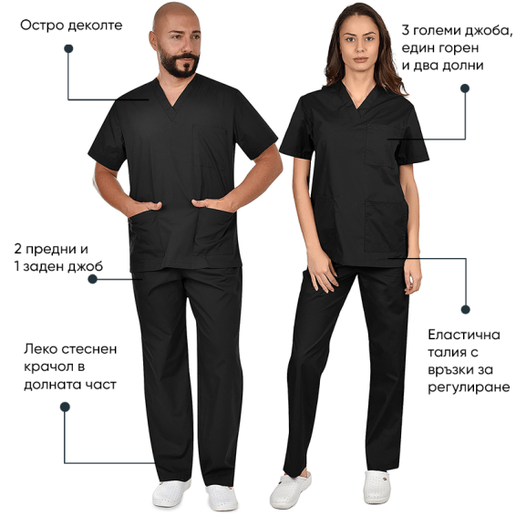 The colors in which the CESARE medical scrub set is available are white; dark blue; black; burgundy; medical blue; iris; blueberry and medical green. CL 40°C color preservation technology is used, which guarantees bright and preserved colors for a long period of time. The scrub set is suitable for the summer season, thanks to the breathable material from which it is made, overcomes perspiration, and keeps you cool throughout the working day. B-well workwear features comfort and elegance in the daily work of doctors, nurses, dentists, pharmacists, veterinarians, medical staff, and medical students.