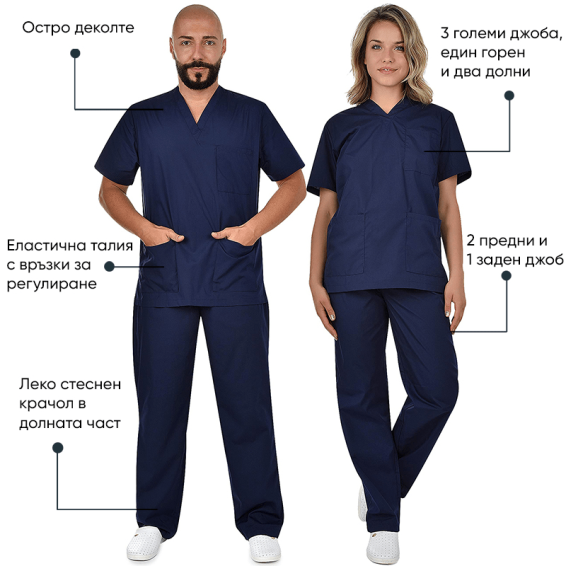 The colors in which the CESARE medical scrub set is available are white; dark blue; black; burgundy; medical blue; iris; blueberry and medical green. CL 40°C color preservation technology is used, which guarantees bright and preserved colors for a long period of time. The scrub set is suitable for the summer season, thanks to the breathable material from which it is made, overcomes perspiration, and keeps you cool throughout the working day. B-well workwear features comfort and elegance in the daily work of doctors, nurses, dentists, pharmacists, veterinarians, medical staff, and medical students.