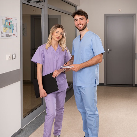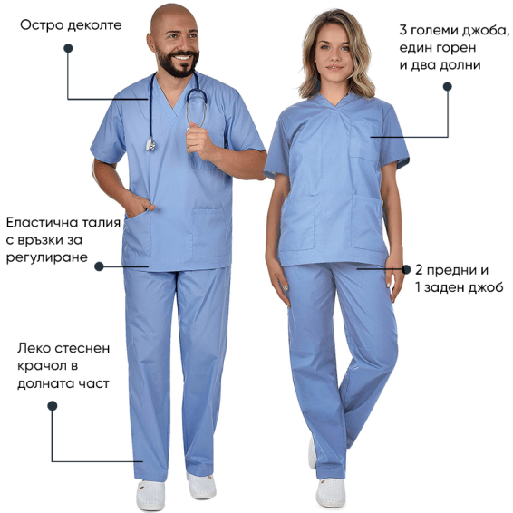 The colors in which the CESARE medical scrub set is available are white; dark blue; black; burgundy; medical blue; iris; blueberry and medical green. CL 40°C color preservation technology is used, which guarantees bright and preserved colors for a long period of time. The scrub set is suitable for the summer season, thanks to the breathable material from which it is made, overcomes perspiration, and keeps you cool throughout the working day. B-well workwear features comfort and elegance in the daily work of doctors, nurses, dentists, pharmacists, veterinarians, medical staff, and medical students.