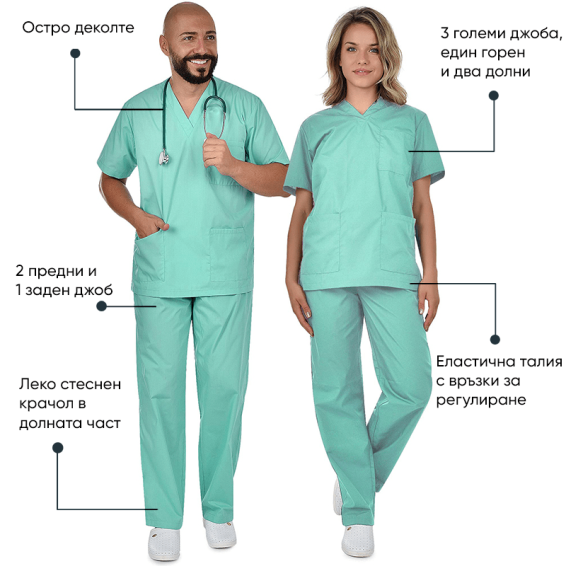 The colors in which the CESARE medical scrub set is available are white; dark blue; black; burgundy; medical blue; iris; blueberry and medical green. CL 40°C color preservation technology is used, which guarantees bright and preserved colors for a long period of time. The scrub set is suitable for the summer season, thanks to the breathable material from which it is made, overcomes perspiration, and keeps you cool throughout the working day. B-well workwear features comfort and elegance in the daily work of doctors, nurses, dentists, pharmacists, veterinarians, medical staff, and medical students.