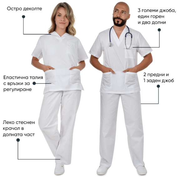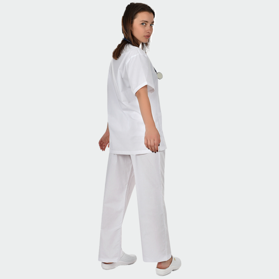 The colors in which the CESARE medical scrub set is available are white; dark blue; black; burgundy; medical blue; iris; blueberry and medical green. CL 40°C color preservation technology is used, which guarantees bright and preserved colors for a long period of time. The scrub set is suitable for the summer season, thanks to the breathable material from which it is made, overcomes perspiration, and keeps you cool throughout the working day. B-well workwear features comfort and elegance in the daily work of doctors, nurses, dentists, pharmacists, veterinarians, medical staff, and medical students.