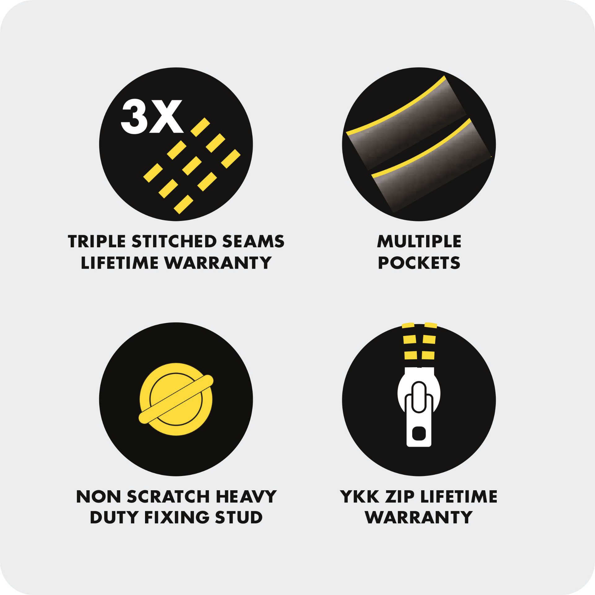 (on thigh) - Heavy duty, non-scratch fixing stud on waistband - Triple stitched on all main seams for ultimate strength - High quality brass YKK zip with lifetime guarantee - Reflective trim to cargo pockets & pocket flaps - 2 x 50mm reflective stripes on each leg