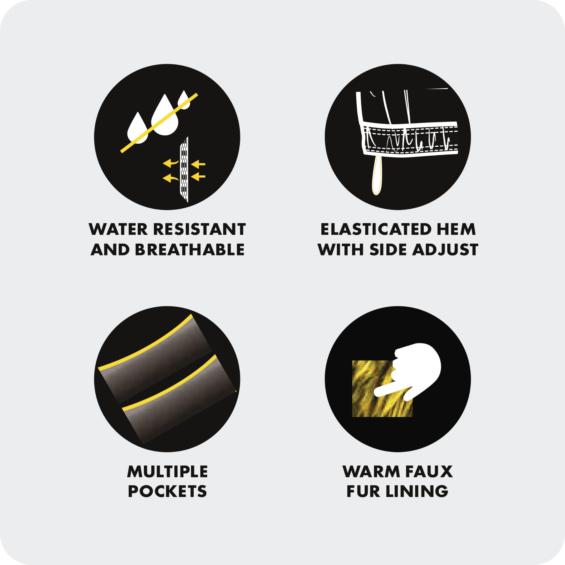 - Weight: 320gsm Laminate 3 Layer, Inner: 300gsm Faux Fur