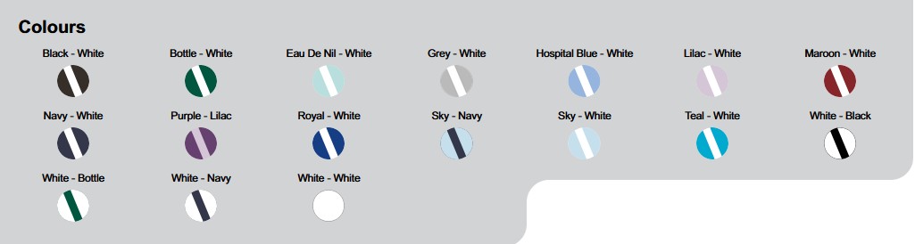 Colours: Black/White, Bottle/White, Eau De nil/White, Grey/White, Hospital Blue/White, Lilac/White, Maroon/White, Navy/White, Purple/Lilac, Royal/White, Sky/Navy, Sky/White, Teal/White, White/Black, White/Navy, White/Bottle, White