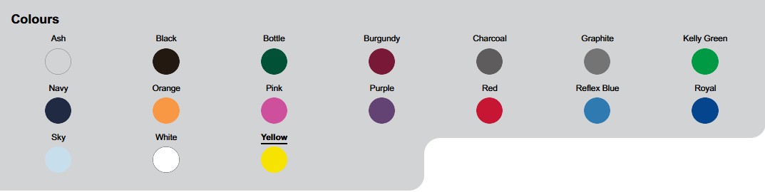 Colours: Ash, Black, Bottle, Burgundy, Charcoal, Graphite, Kelly Green, Navy, Orange, Pink, Purple, Red, Reflex Blue, Royal, Sky, White, Yellow