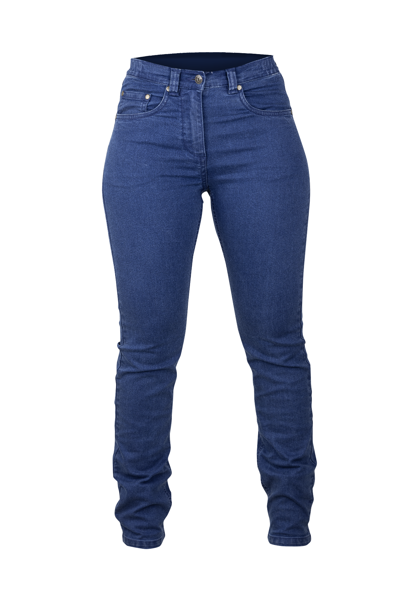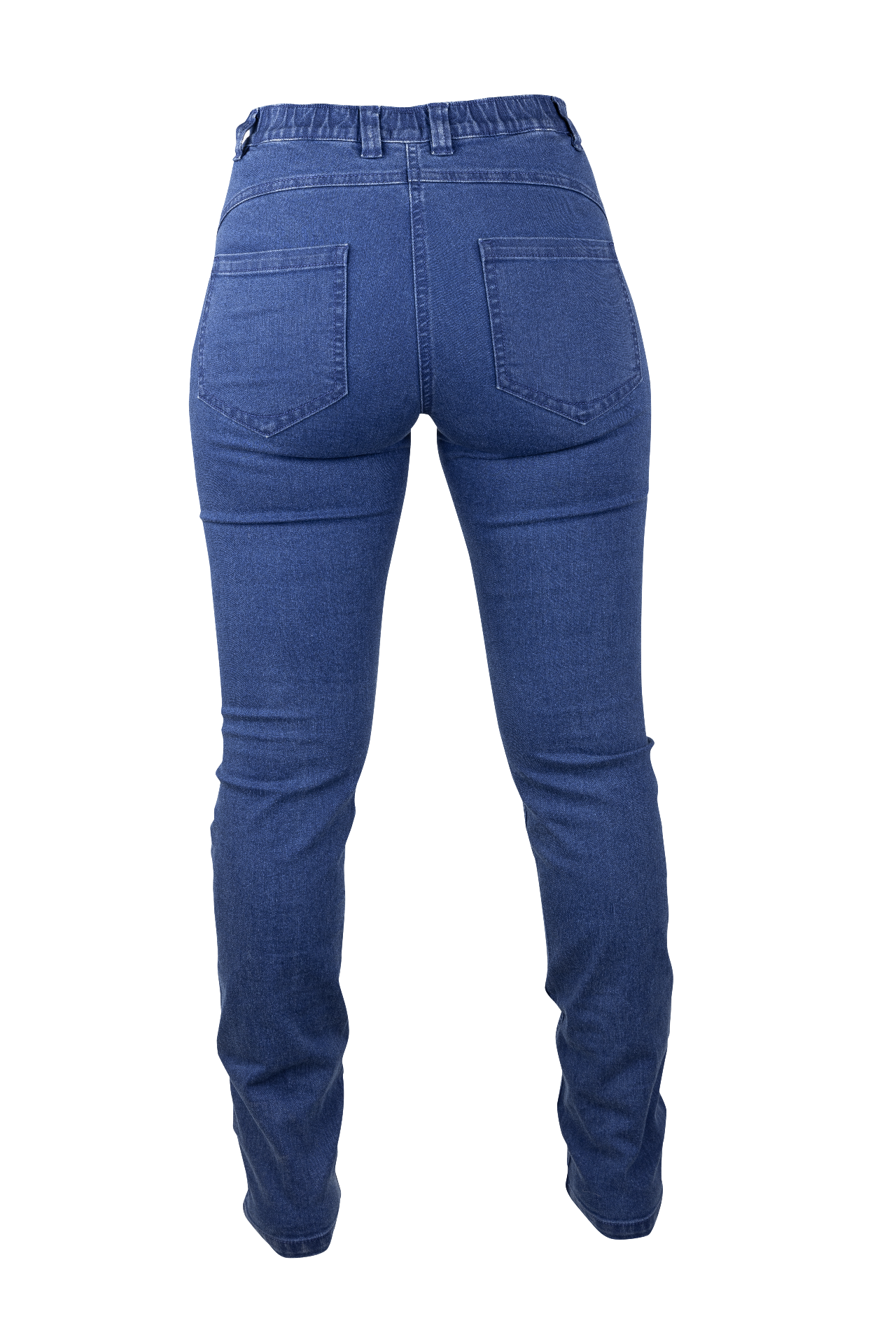 Stretch denim trousers - Elasticated waistband at the sides and back - Belt with 6 loops, fastened with a