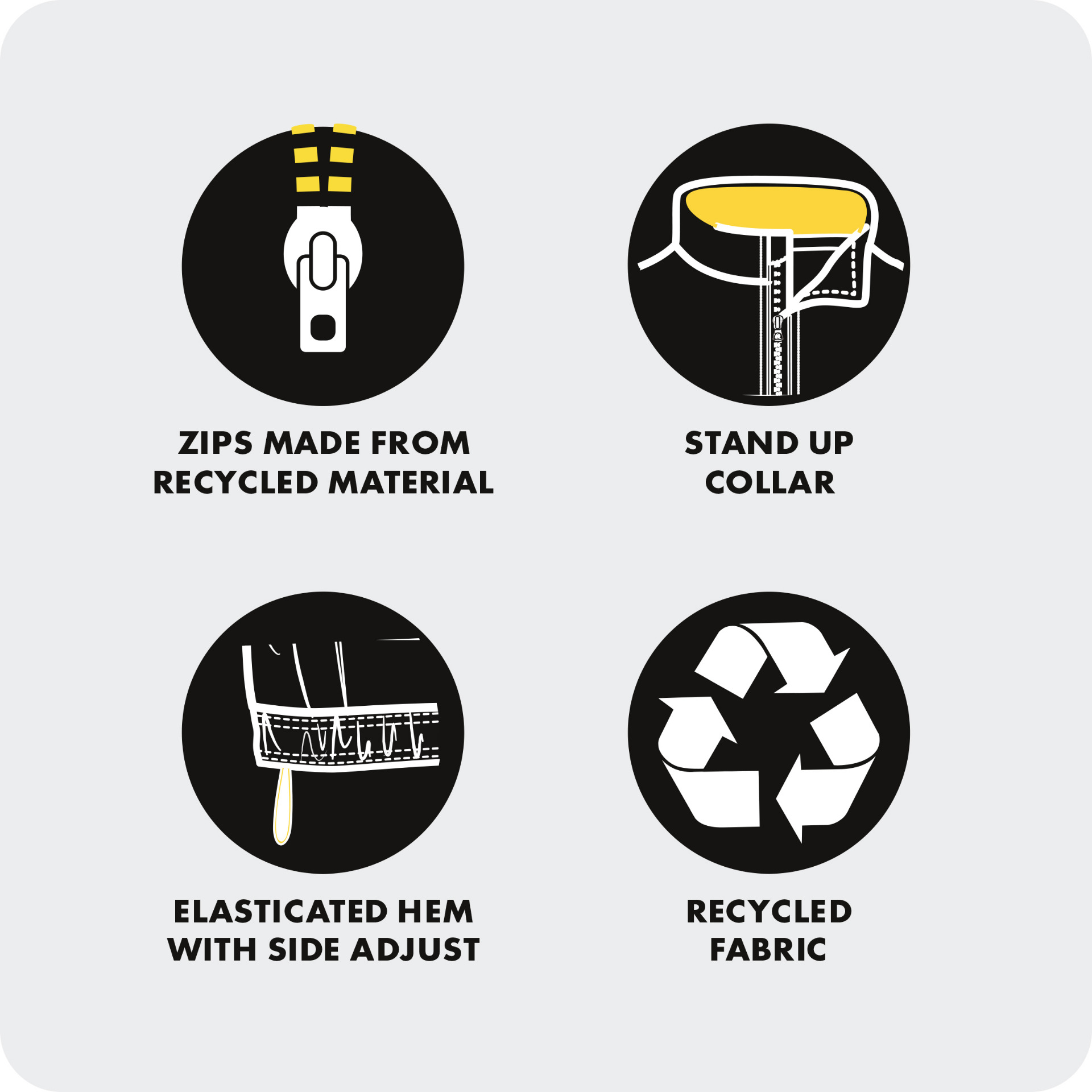 - Fabric: 100% GRS Post-consumer Recycled Polyester