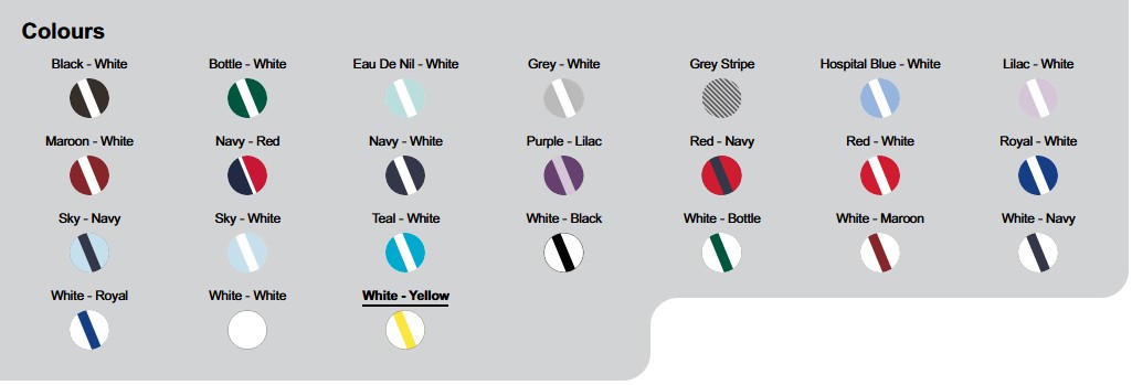 Colours: Black/White, Bottle/White, Eau De nil/White, Grey/White, Hospital Blue/White, Lilac/White, Maroon/White, Navy/Red, Navy/White, Purple/Lilac, Red/White, Royal/White, Sky/Navy, Sky/White, Teal/White, White/Black, White/Maroon, White/Navy, White