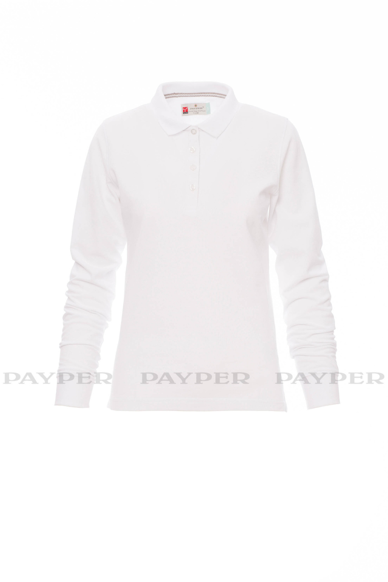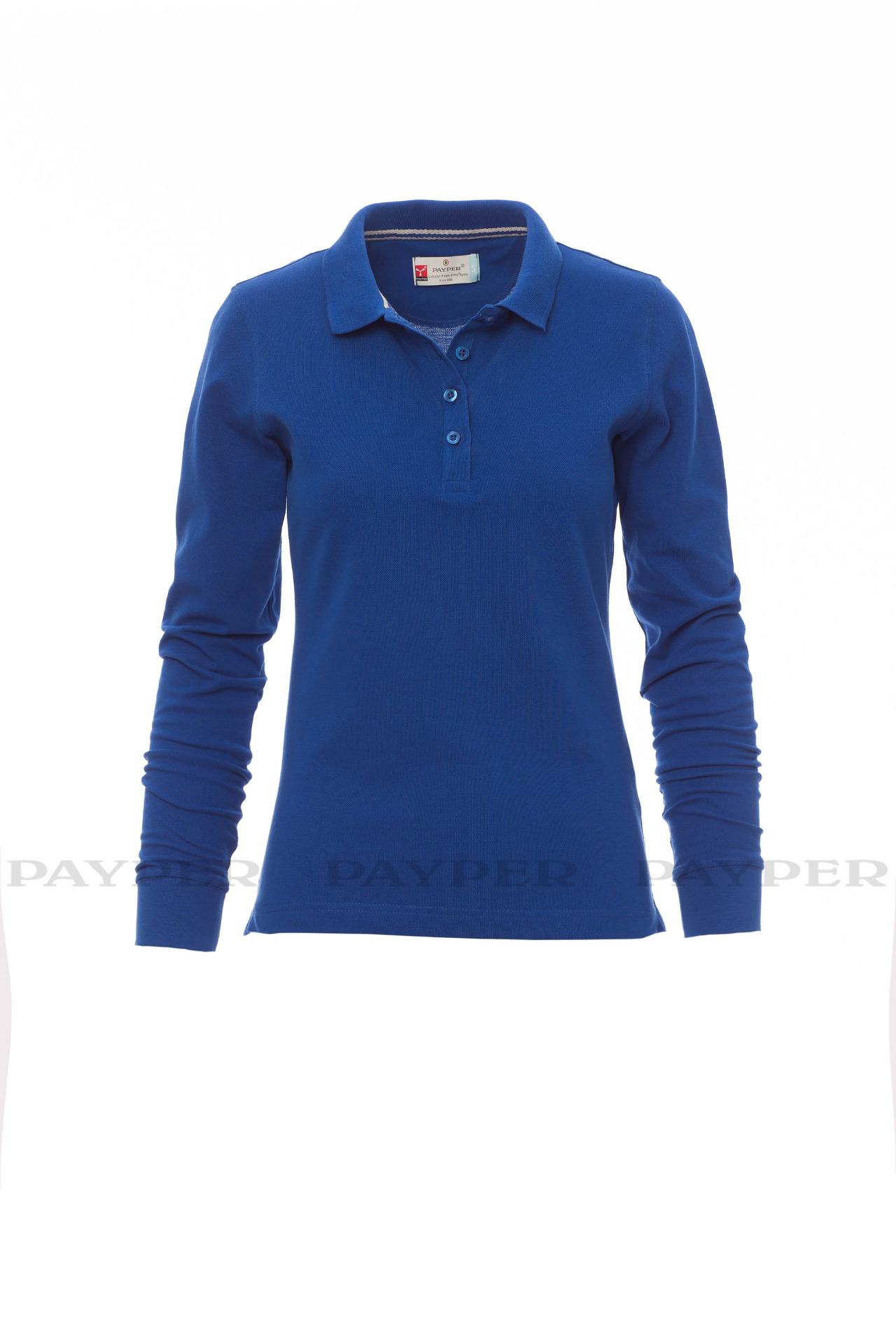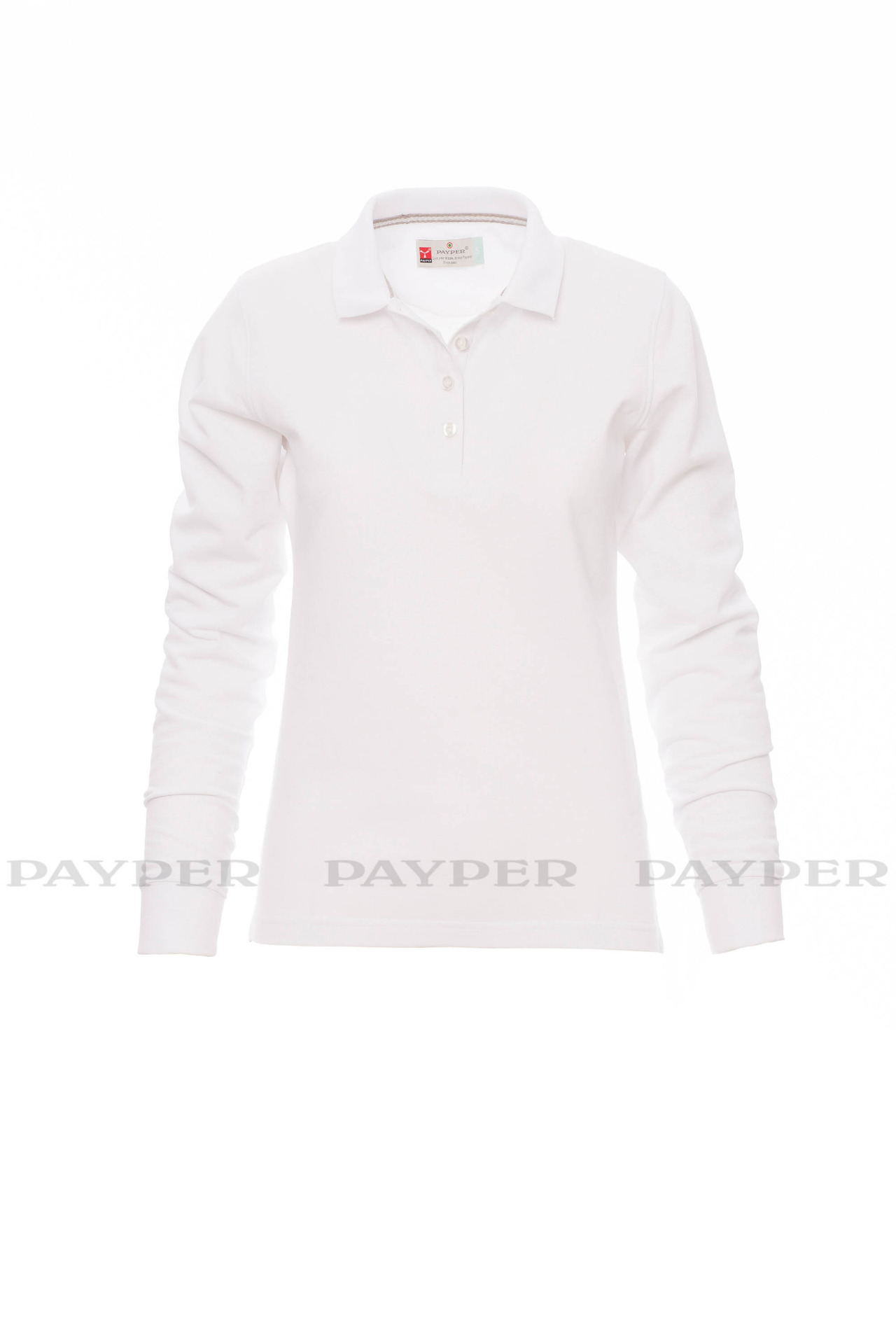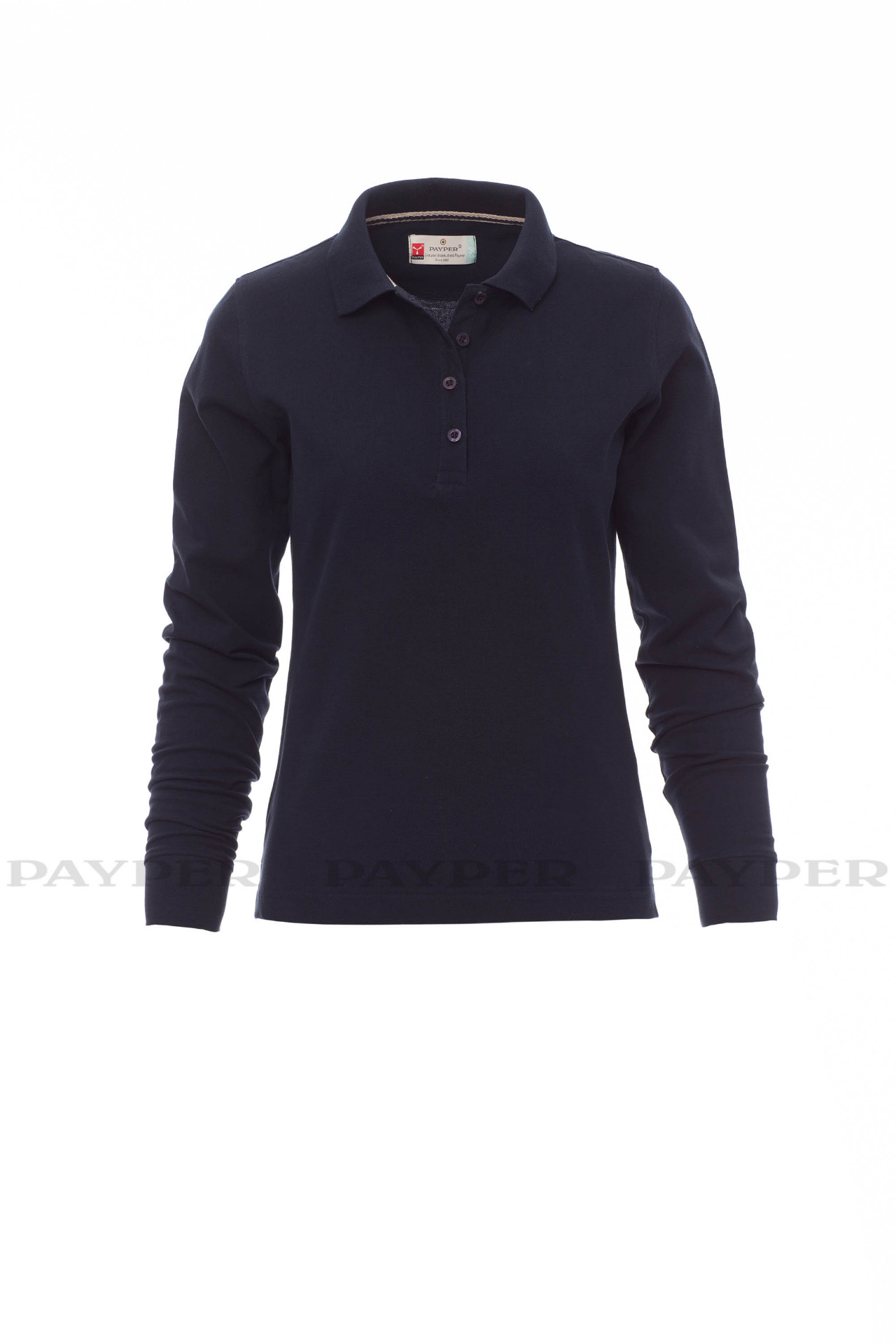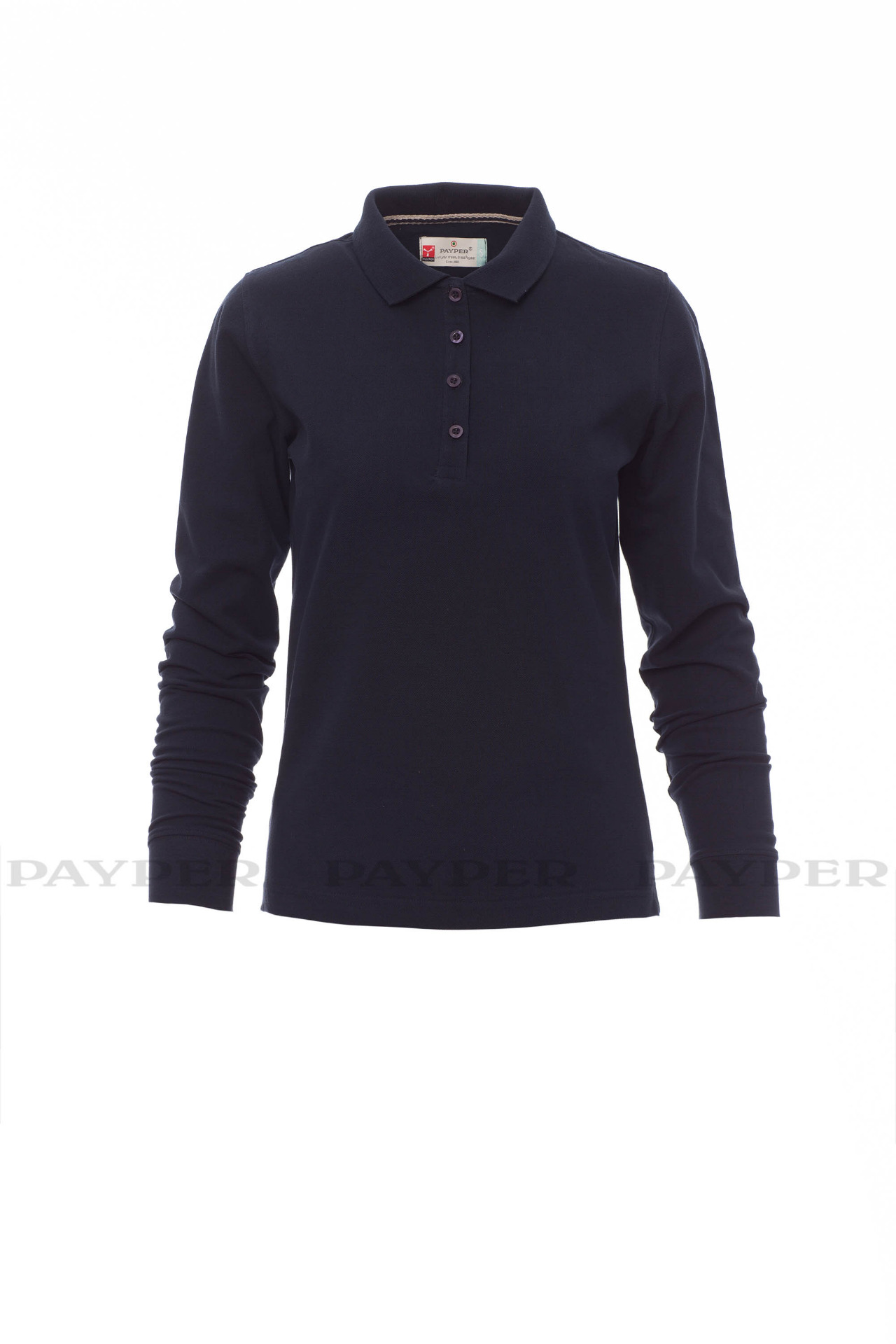 Women's long-sleeved fitted polo shirt with 4, matching, mother-of-pearl