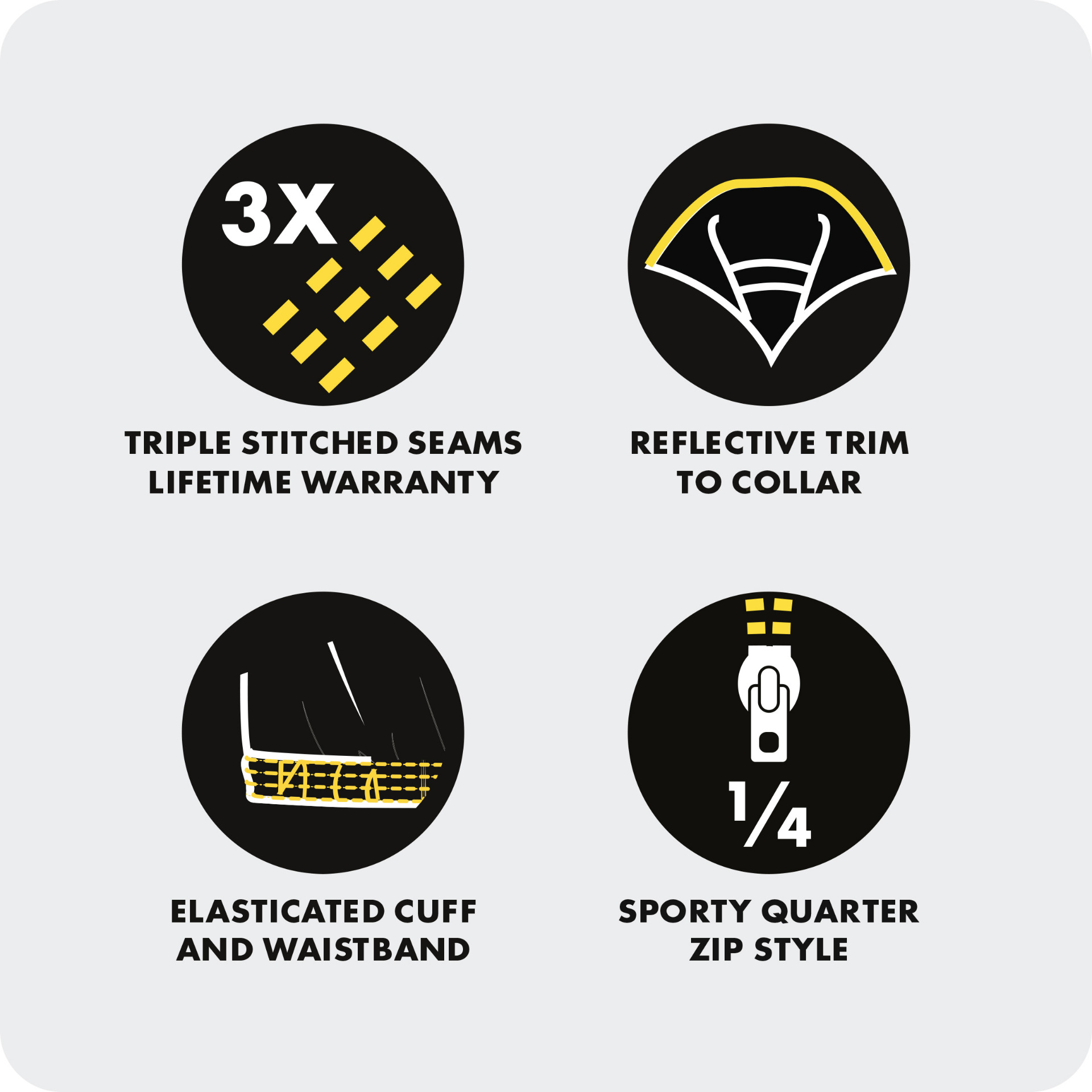 High quality, premium weight, quarter zip sweatshirt - YKK zips with lifetime warranty - Elasticated cuffs and waistband - Brushed fleece inner - Half moon yoke at neck - Set in sleeve styling - Ideal for corporate logos - Very comfortable to wear - Triple stitched on all main seams for ultimate strength - Reflective trim to the collar - 1/4 style sporty reflective zip