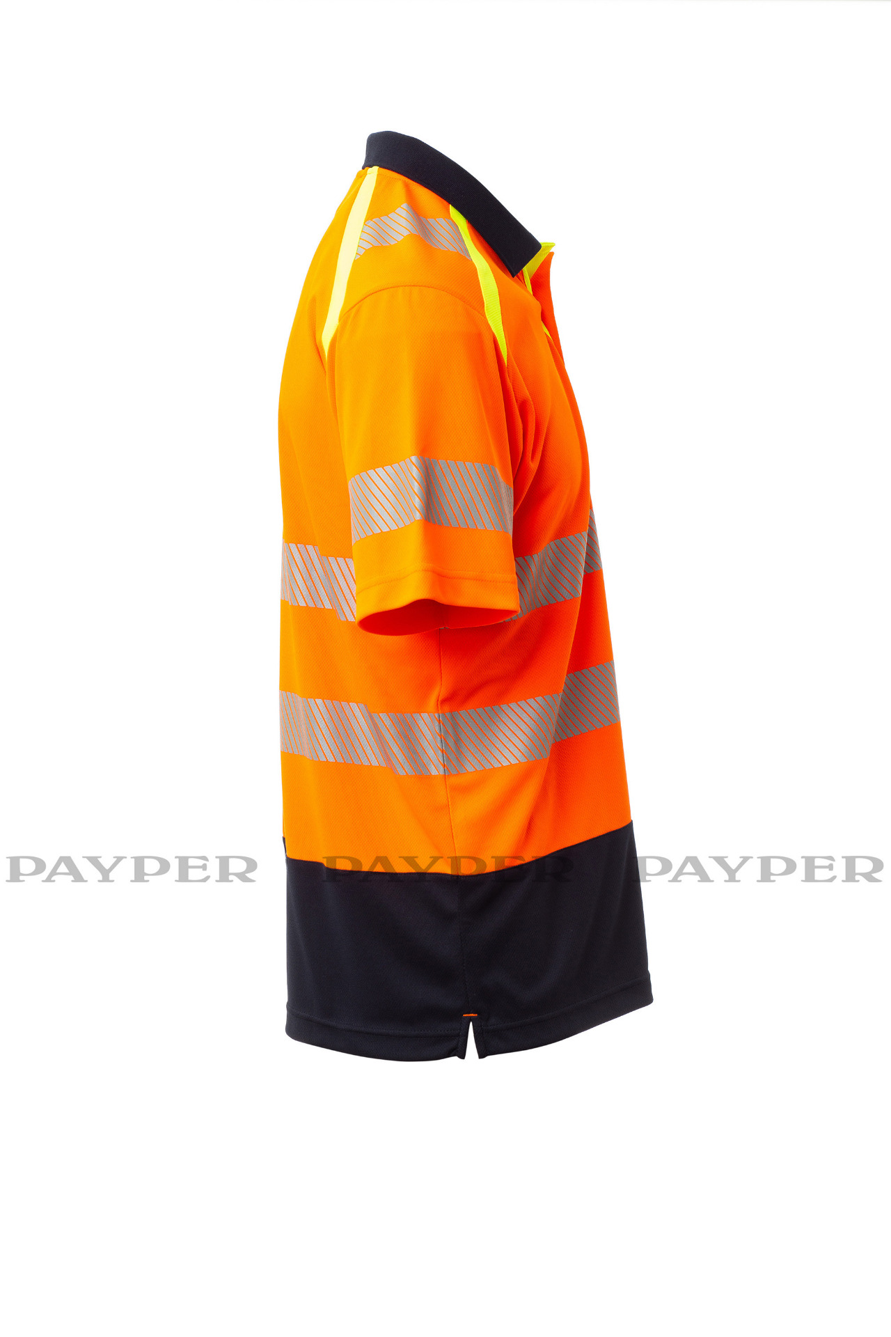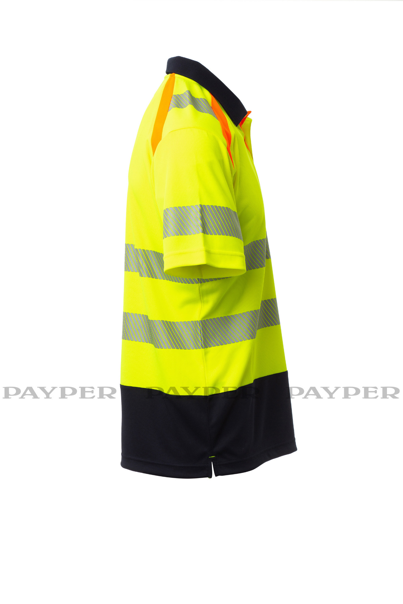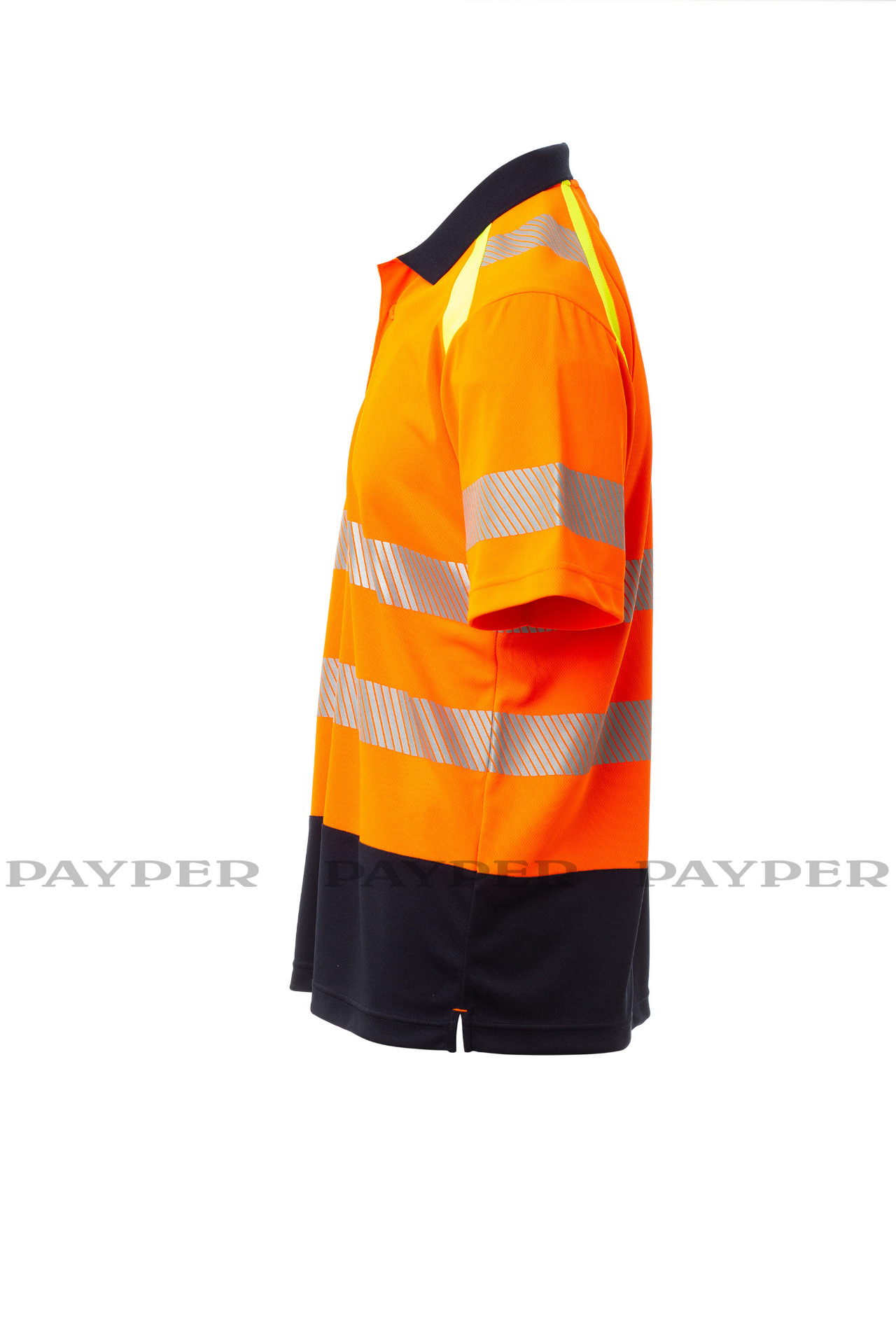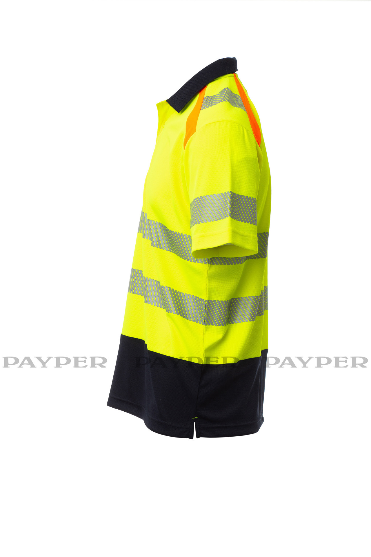 Short-sleeved, two-tone, high visibility polo shirt. 3-button collar,