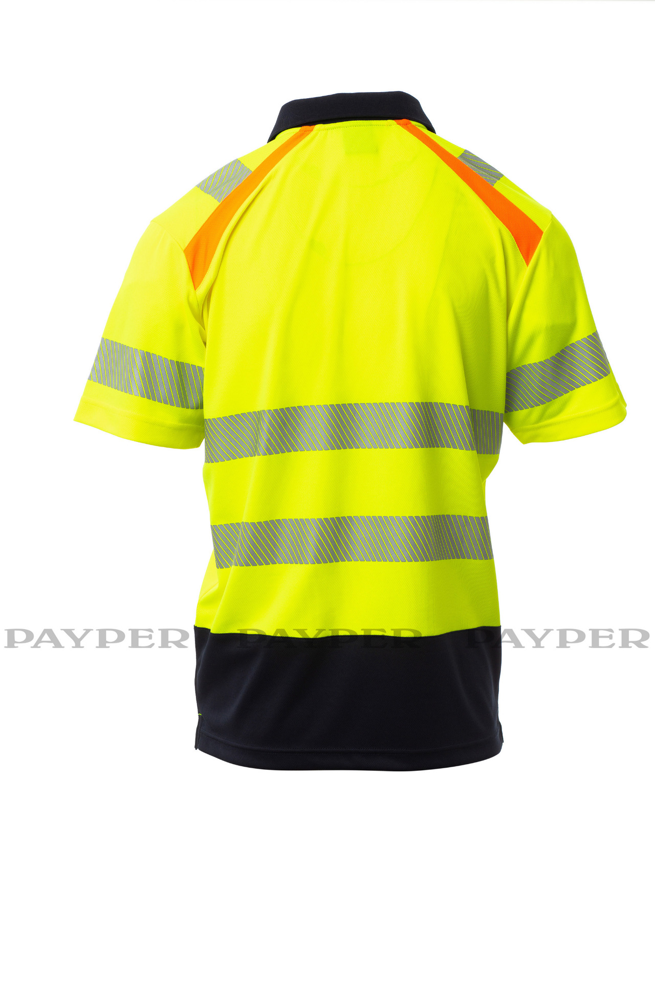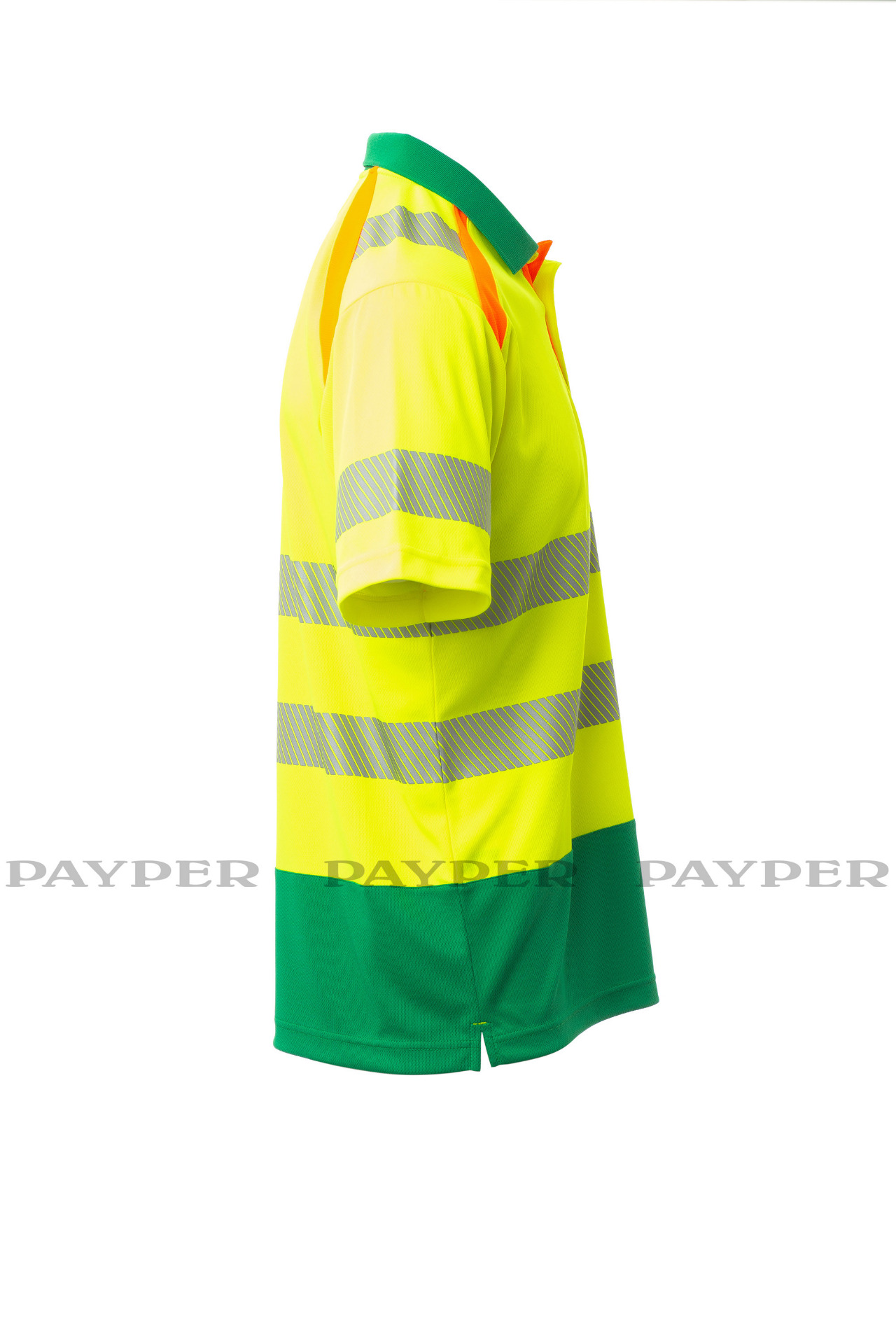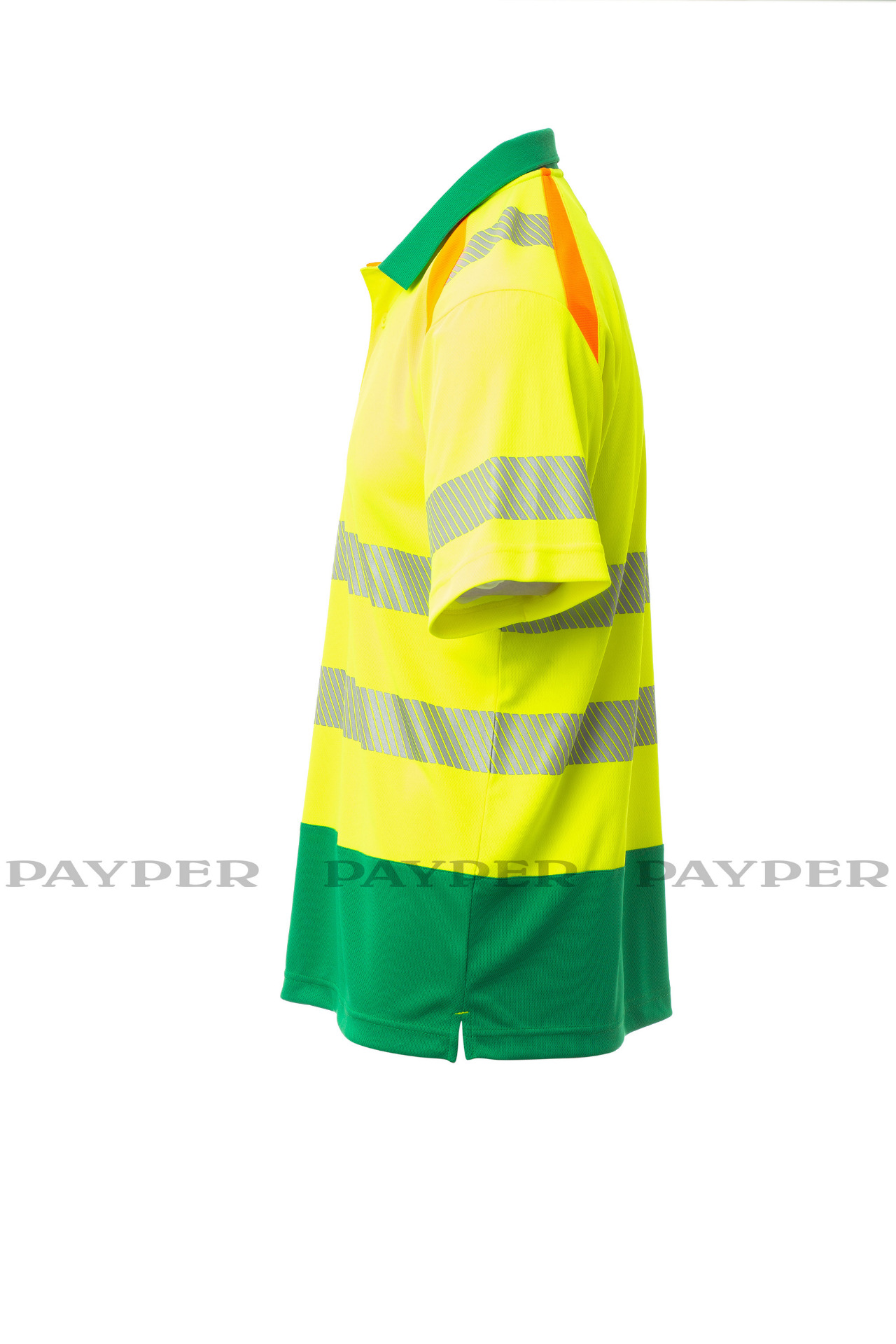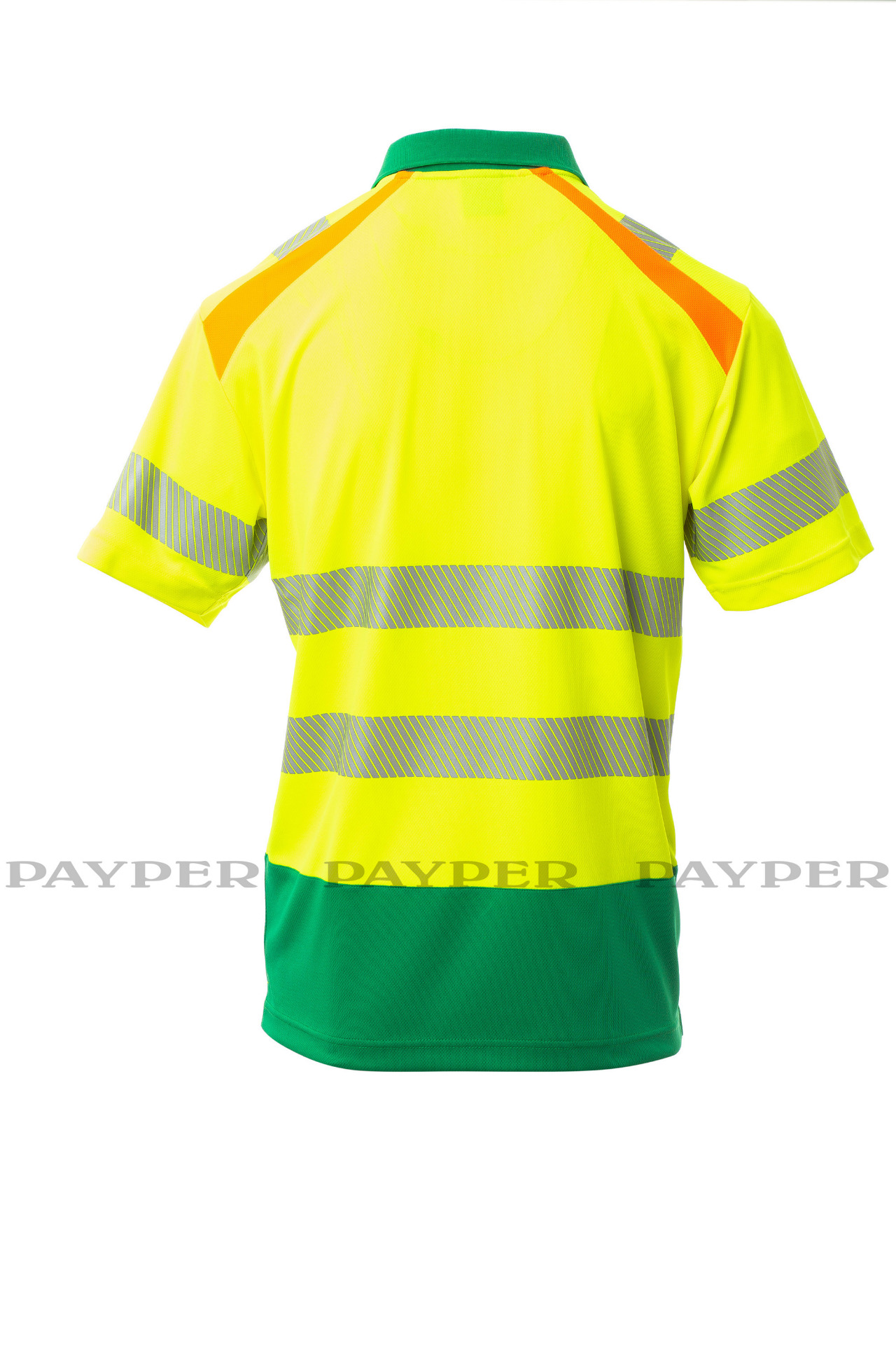Short-sleeved, two-tone, high visibility polo shirt. 3-button collar,