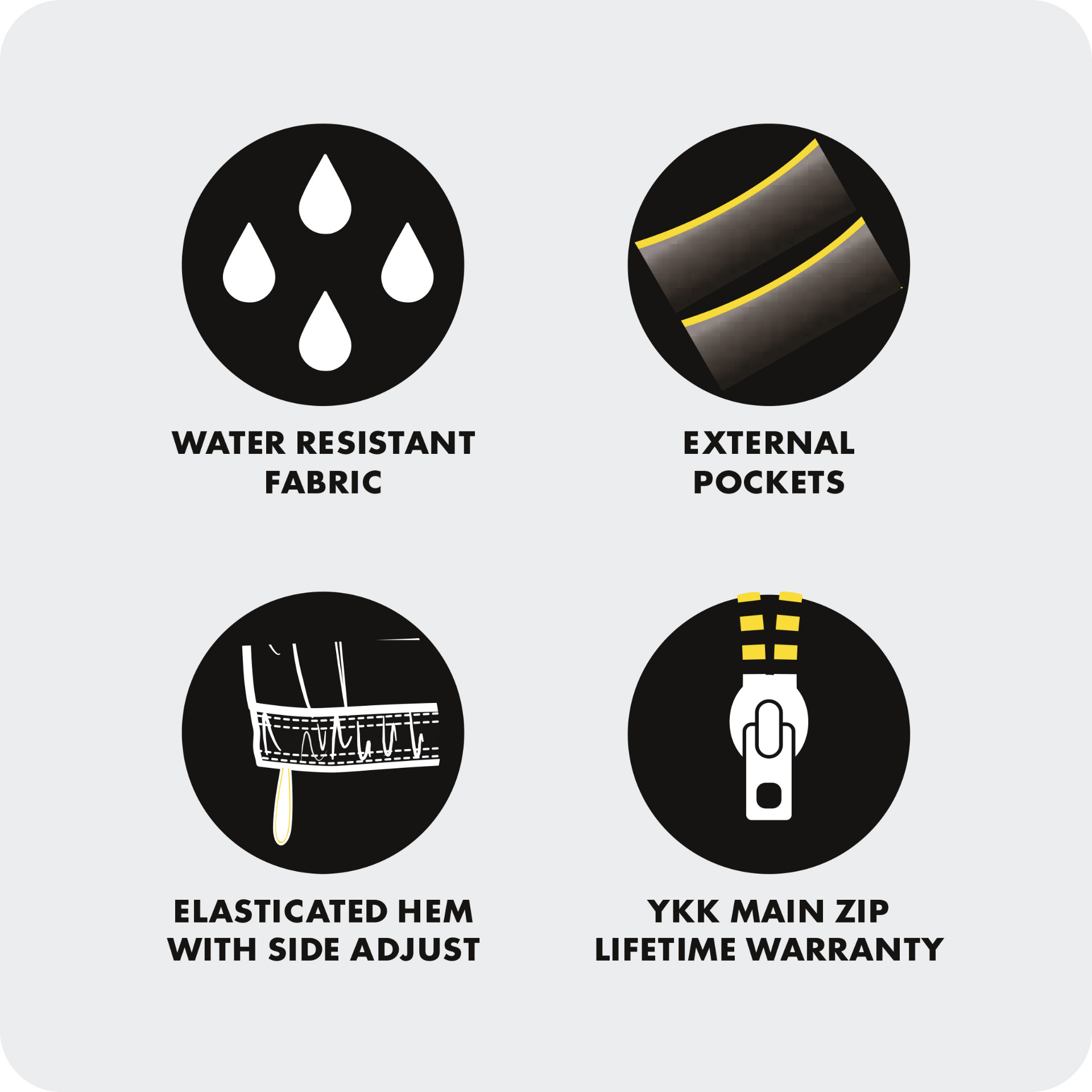 High-performance technical fabric - Water resistant fabric - Two external pockets with zip closure - YKK main zip with lifetime warranty - Elasticated hem with side adjusters - Twin needle stitched seams for durability