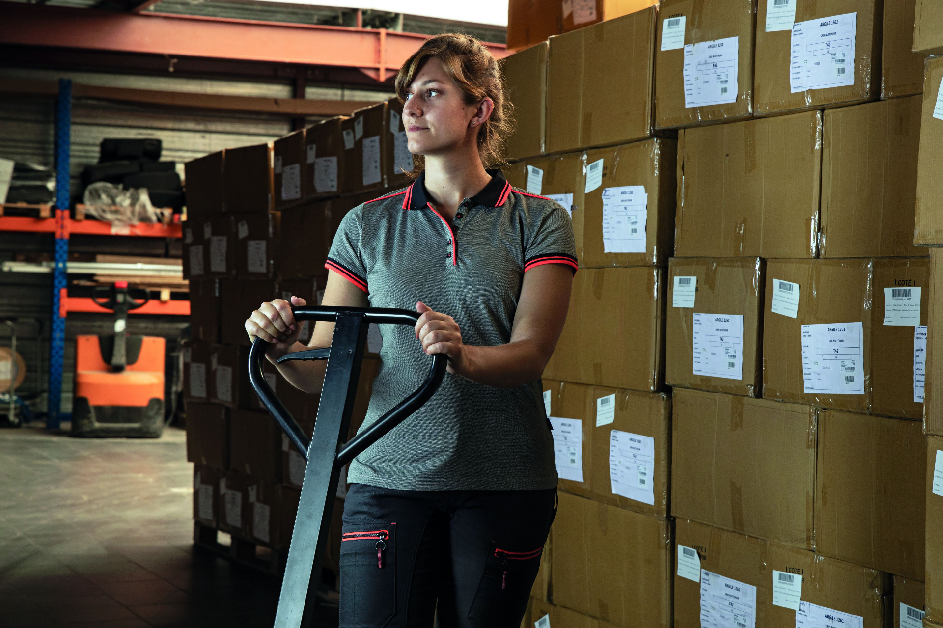 Black flat rib with fluorecent red stripes on collar and sleeves - Polo collar - Front placket with 5 buttons - Fluorecent red piping on shoulders and front placket