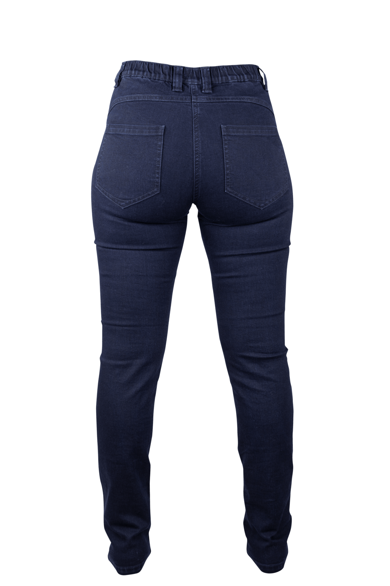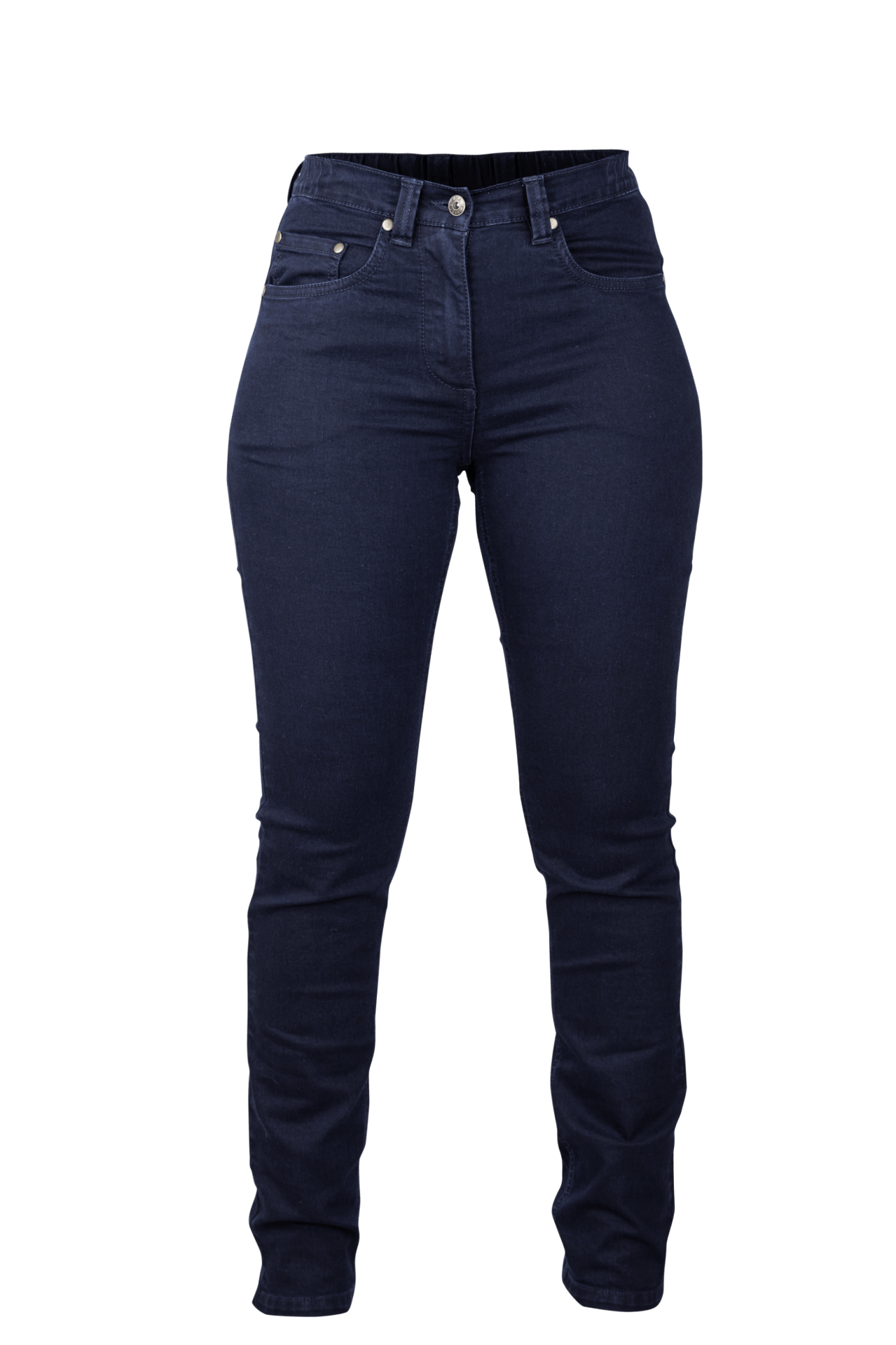 Stretch denim trousers - Elasticated waistband at the sides and back - Belt with 6 loops, fastened with a