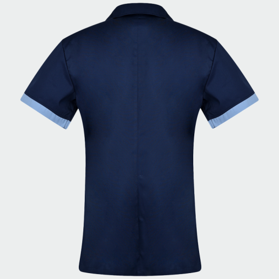 The GABI scrub top with buttons has a semi-fitted silhouette by b-well. It is made of 65% polyester and 35% cotton fabric mix. It is available in three colors - white, dark blue and light blue.