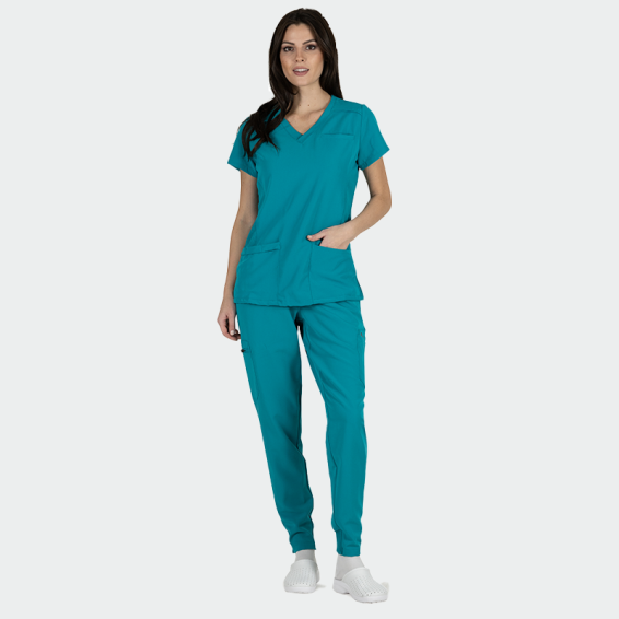 JULIA medical scrub by the Bwell brand is made from 72% polyester, 21%