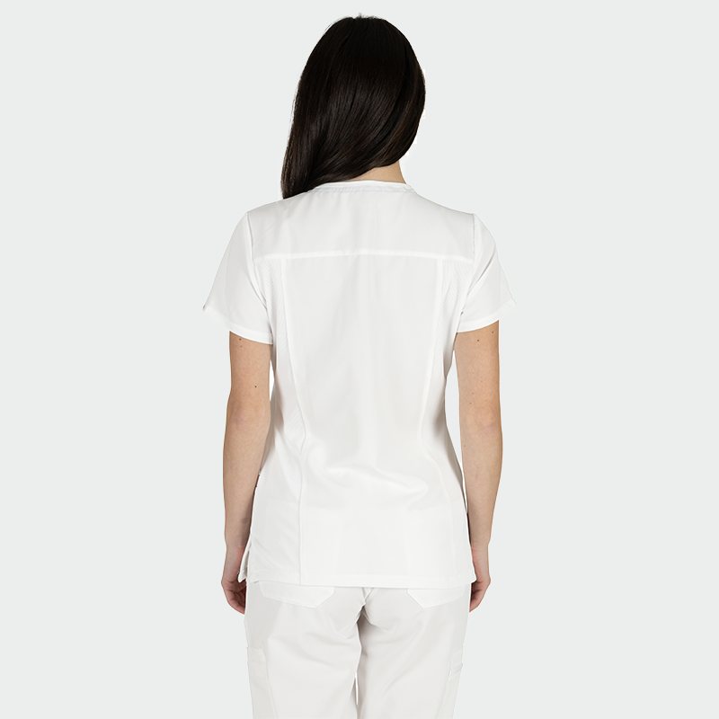 The JULIA medical scrub is a stylish women's tunic with short sleeves, crafted from a lightweight fabric blend of polyester, viscose, and elastane, allowing for greater freedom of movement. The modern cut ensures ease of wear, while the fabric composition provides exceptional softness against the skin. The tunic features a V-neckline, practical pockets with compartments for personal belongings, and a loop for a badge.