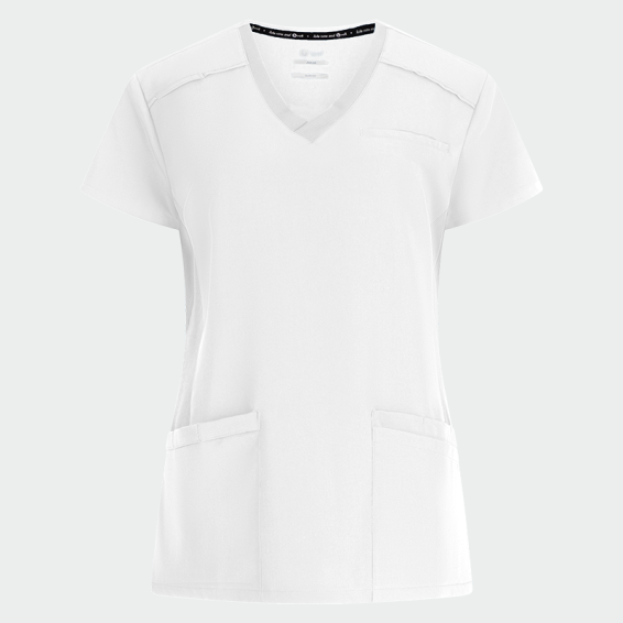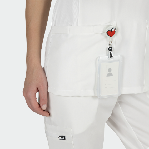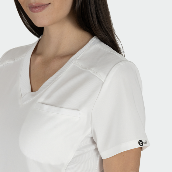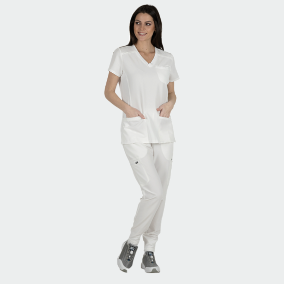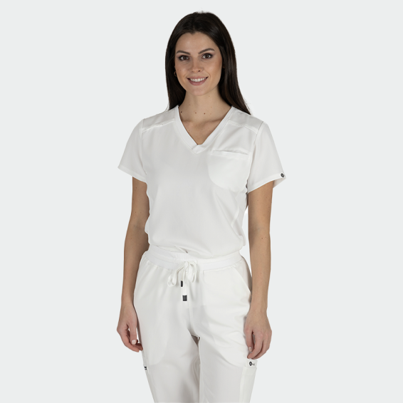 The JULIA medical scrub by the Bwell brand is made from 72% polyester, 21% viscose, and 7% elastane with a fabric density of 200 g/m², making it a popular choice for medical professionals and beyond.