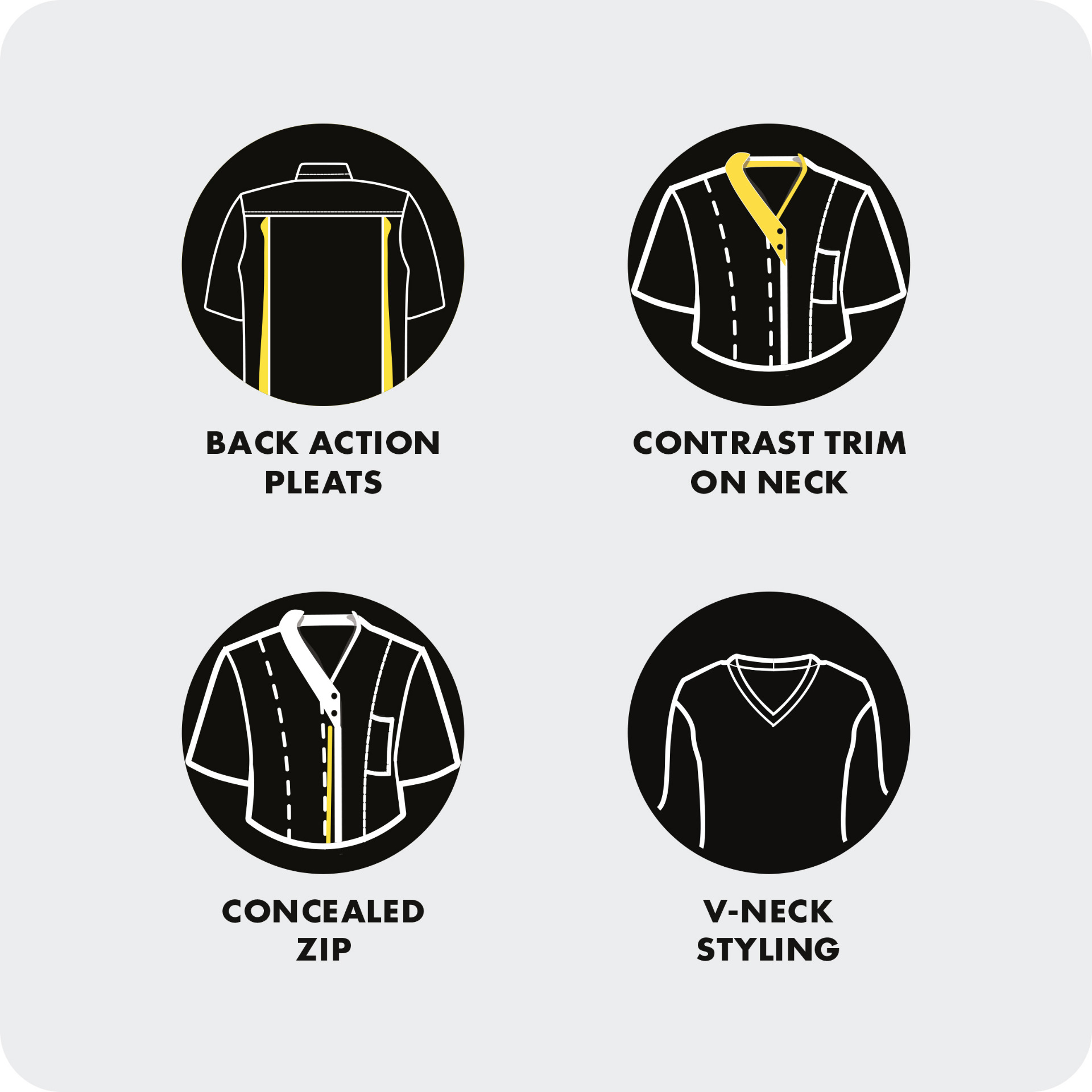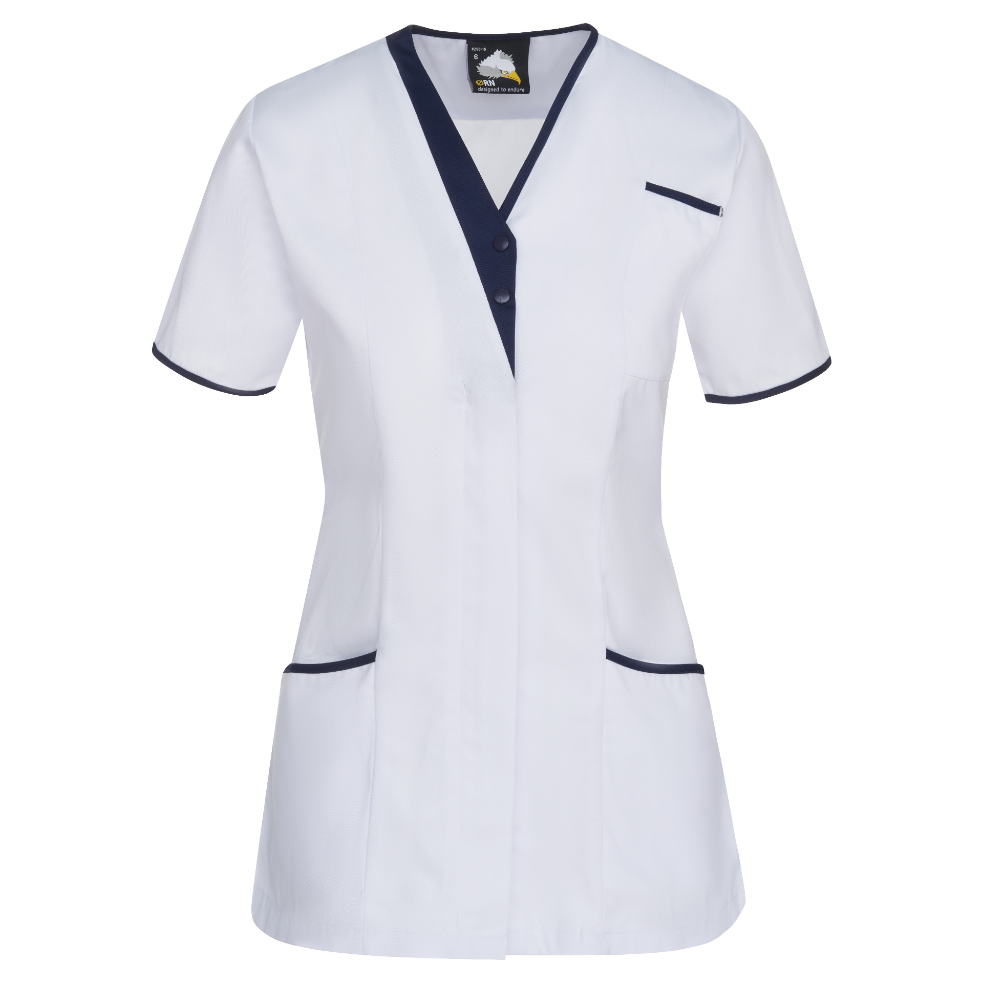 V-neck tunic - Contrast trim on neck - Double action back for ultimate comfort - Concealed zip fastening - Back vents for ease of movement - A fashionable, long line tunic suitable for healthcare professionals including nurses, carers, dentists and vets - Flattering, semi-fit shaping and contrast trim for a crisp look - One chest pocket and two front hip pockets with contrasting trim - Made from hard wearing, easy care fabric