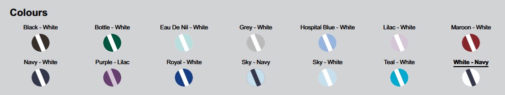 Colours: Black/White, Bottle/White, Eau De nil/White, Grey/White, Hospital Blue/White, Lilac/White, Maroon/White, Navy/White, Purple/Lilac, Royal/White, Sky/Navy, Sky/White, Teal/White, White/Navy