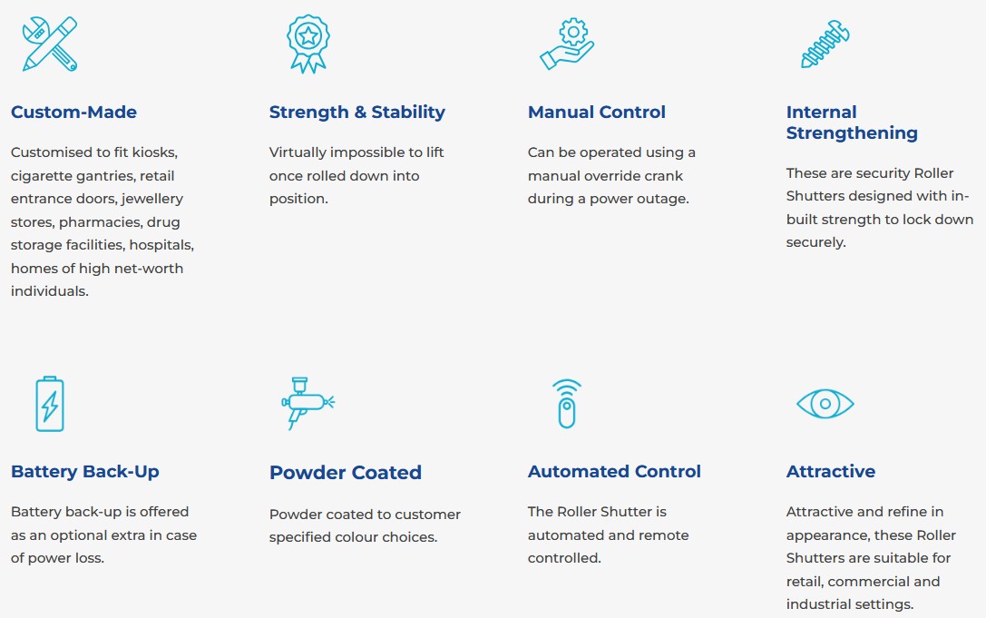 Roller shutters are ideal for business owners. When fitted to doors and windows, the shutters provide a high level of protection outside of operating hours. During working hours, roller shutters protect staff members from intruders when necessary, such as when cashing up. The shutters can be used to close off private administrative areas from the general public.